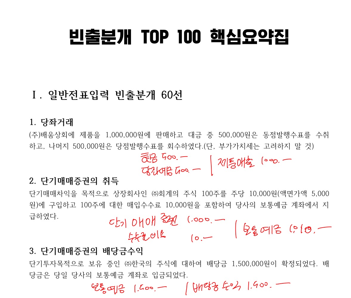 사실 시간 없어서 책에 있는 기출 5회랑 올해 기출 3회만 푸는데도 벅찼습니다⋯ 그래도 최신 기출 3회분은 최소 3회독~ 어려운 문제는 계속해서 보면서 눈에 바르려고 노력했어요! 그렇게 실전 문제 감 쌓고 시험 전날 밤에 박진혁 선생님이 제공해주시는 빈출분개 TOP100 풀었어요..! 시험 시작 전까지 빈출 분개 자꾸 틀리는 것만 모아서 봤답니다.. 봐도 봐도 헷갈리는 것들 위주로요! 그럼 시험장 가서 헷갈릴 망정 모르는 분개는 없어요 ^ ^