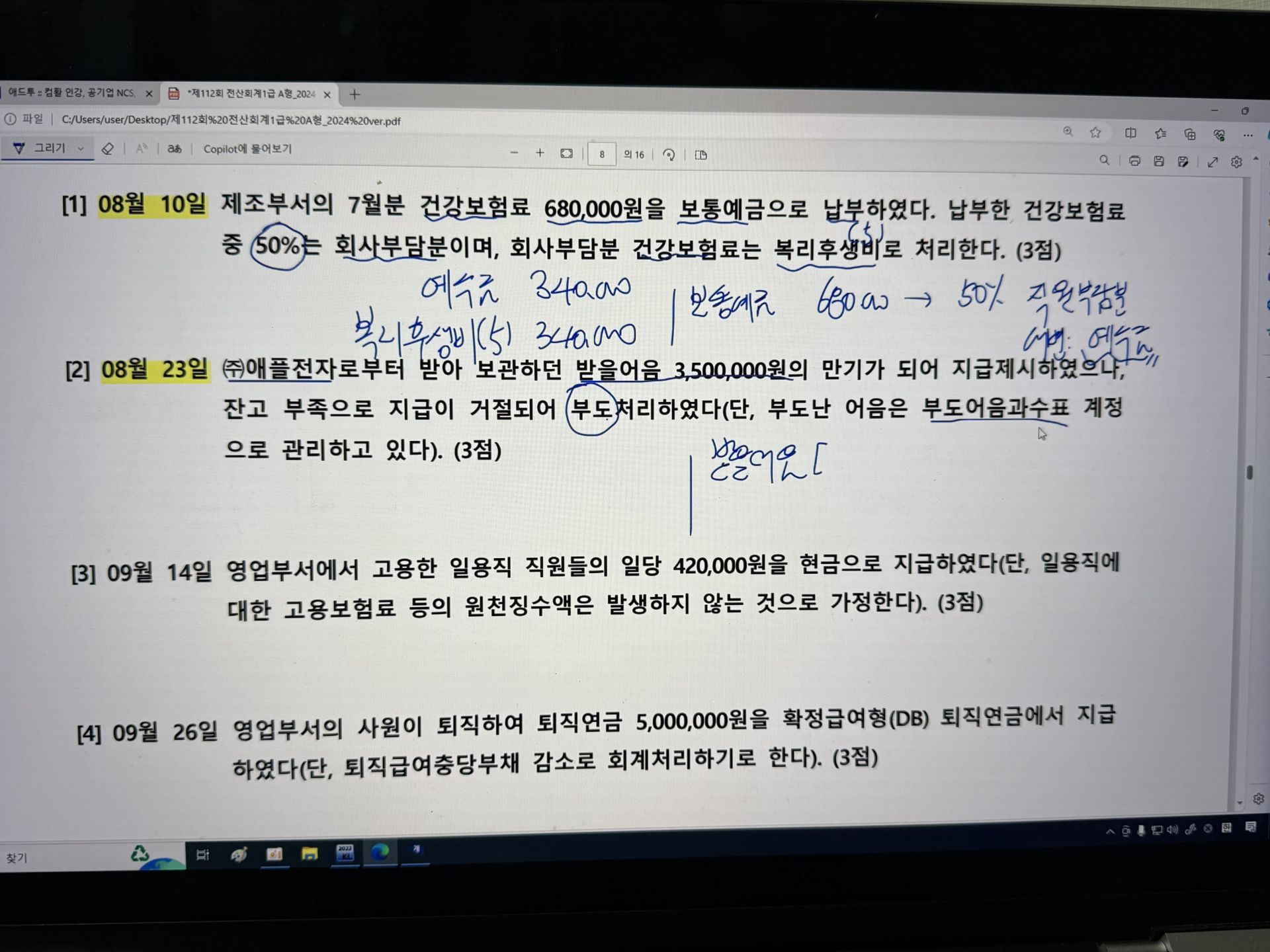 일단 빠르게 강의 한 번 다 돌리고(여기서 2주 소요) 실무도 다 따라서 공부했어요. 강의 2/3 보는 시점부터는 처음부터 복습하면서 문제랑 실무 분개도 다시 다 해봤습니다. 그렇게 약 남은 1주는 뒤에 원가회계(이 파트는 진도가 잘 안나가더라구요 ㅠㅠ 어려워서 그런가) 진도까지 나가면서 앞에 재무회계 파트 분개 복습을 꼼꼼히 하려고 했어요!