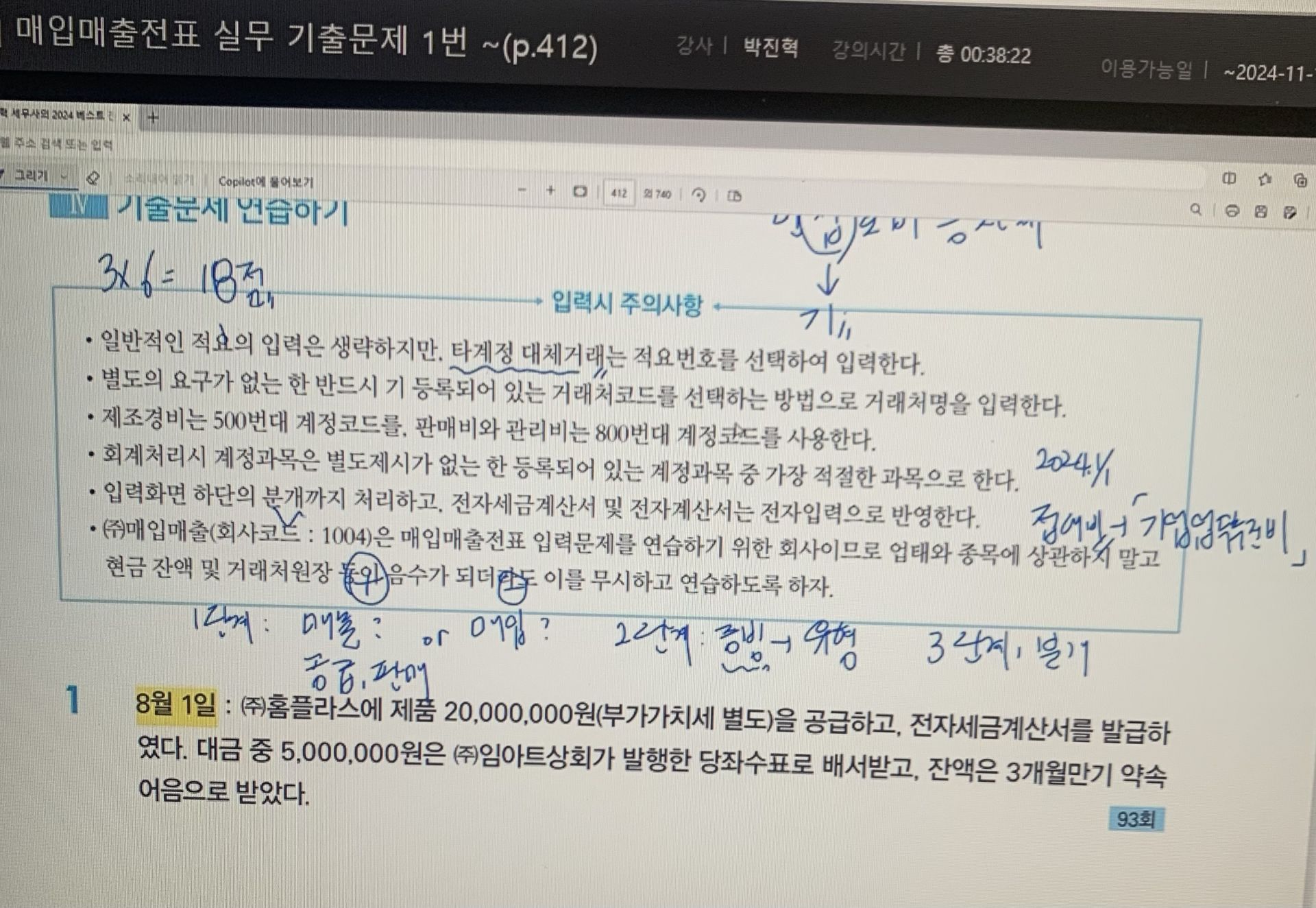 박진혁 선생님의 전산회계 1급 수강중인데, 2월달 시험을 대비하는 차원에서 기출 강의를 먼저 듣고 있는 상황입니다이론 파트 기출 설명에 있어서도 왜 정답인지 상세하게 설명해주셔서 효율적으로 공부할 수 있는 것 같아요