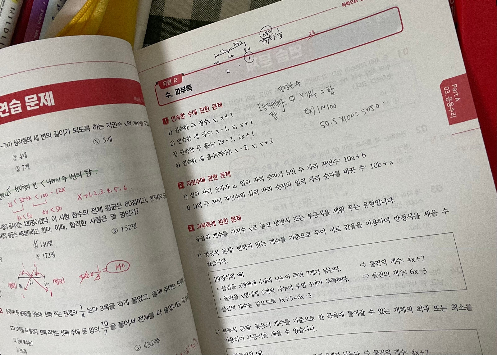 처음 시작할 때만 해도 자신만만했던 제 과거를 반성합니다…또르르.. 책을 펴자마자 마주한 응용수리와 자료해석의 당혹감은 정말 잊지 못해요ㅠㅠ 중학 수학 내용이라 쉬울 줄 알았는데 막상 풀려니 손도 못 대겠더라고요. 하지만 다행히 수웅쌤을 만나서 극복하고 있는 것 같아 기쁜 마음으로 후기작성합니다!