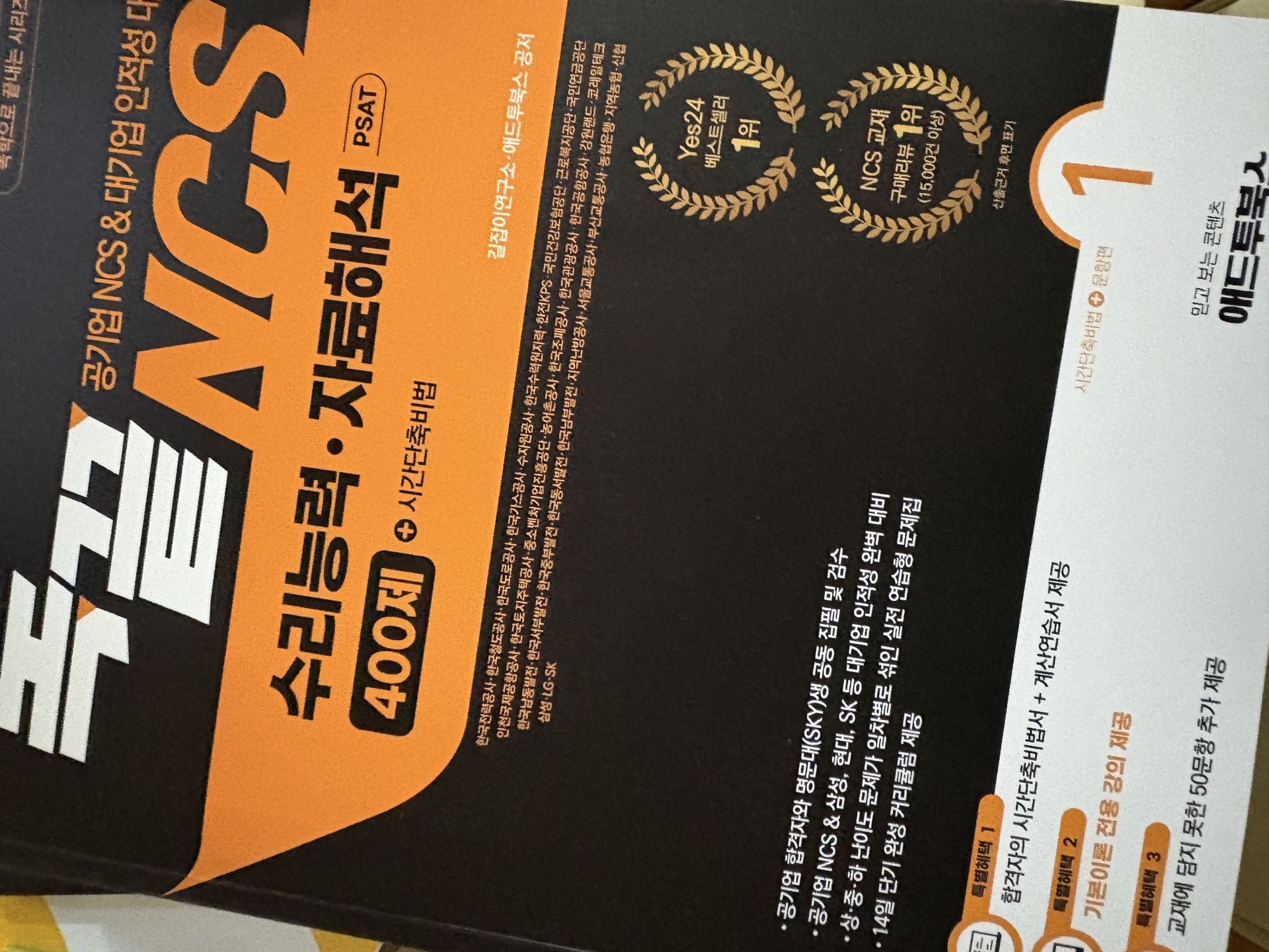 독끝 NCS 문제해결능력+자원관리능력을 사용해보고 좋아서 수리능력, 자료해석도 풀어봤다. 수많은 공겹 취준생들에게 혼자 독학하기에 정말 좋은 교재고 인강이라고하는데, 왜 그런지 지난번 문제해결능력+자원관리때도 느꼈지만 이번 수리능력, 자료해석 교재를 보면서도 또 느꼈다. 공기업 준비하는 독학러들에게 진짜 추천할만한 교재랑 인강이라고 생각된다. 공기업, PSAT 합격자의 NCS 문제풀이 시간단축 팁을 전체 문항에서 배울 수 있어 빠르게 답을 찾는 연습이 가능한 교재였다.