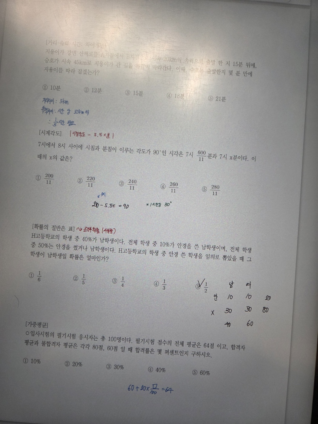자료해석 파트에서는 표와 그래프를 빠르게 읽어내는 연습을 반복하면서 문제 풀이 속도가 확실히 향상되었고, 응용수리 영역에서도 계산 실수를 줄이는 방법과 시간 단축 요령을 배울 수 있었습니다.