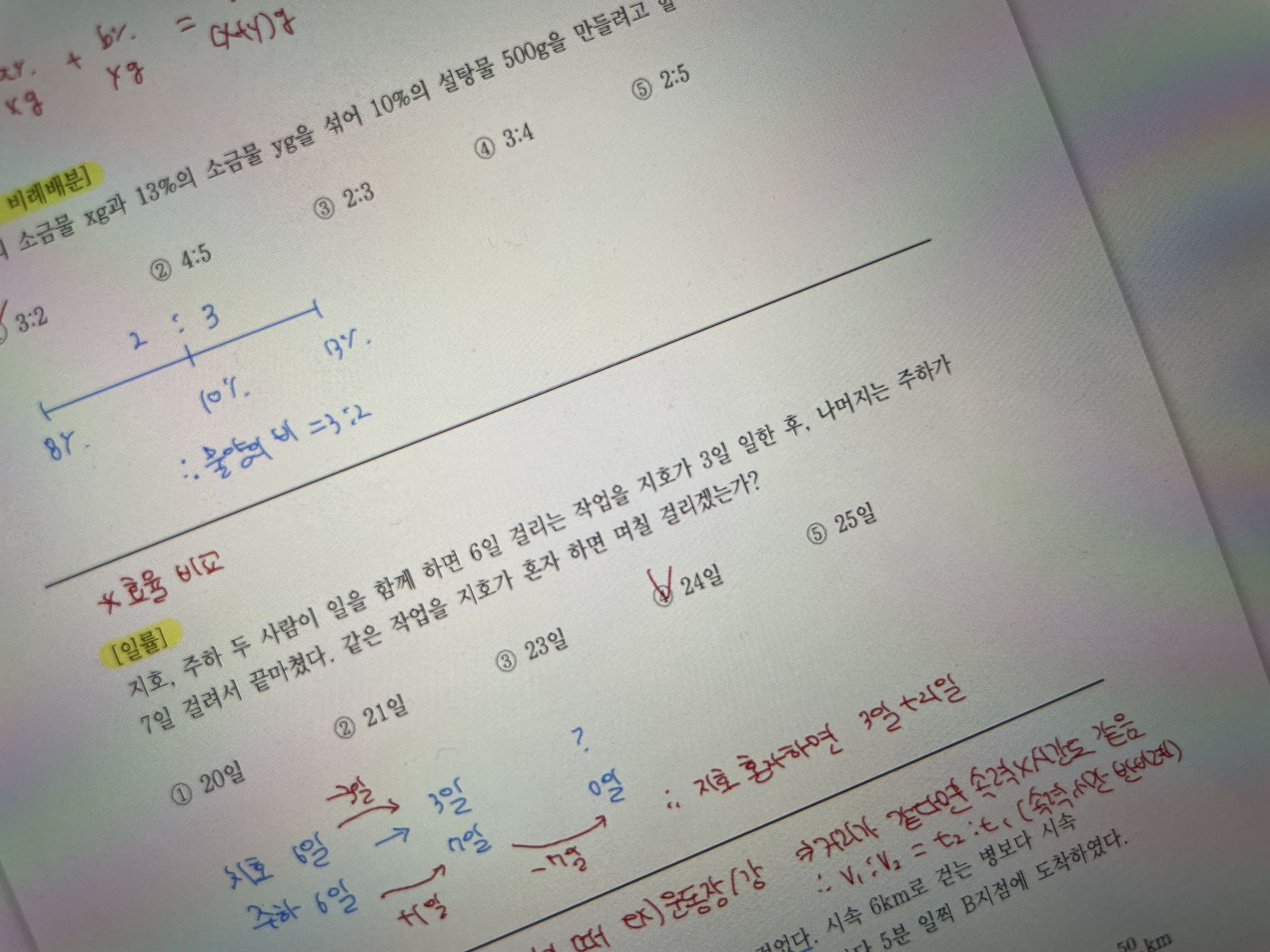 처음 시작할 때만 해도 자신만만했던 제 과거를 반성합니다…또르르.. 책을 펴자마자 마주한 응용수리와 자료해석의 당혹감은 정말 잊지 못해요ㅠㅠ 중학 수학 내용이라 쉬울 줄 알았는데 막상 풀려니 손도 못 대겠더라고요. 하지만 다행히 수웅쌤을 만나서 극복하고 있는 것 같아 기쁜 마음으로 후기작성합니다!