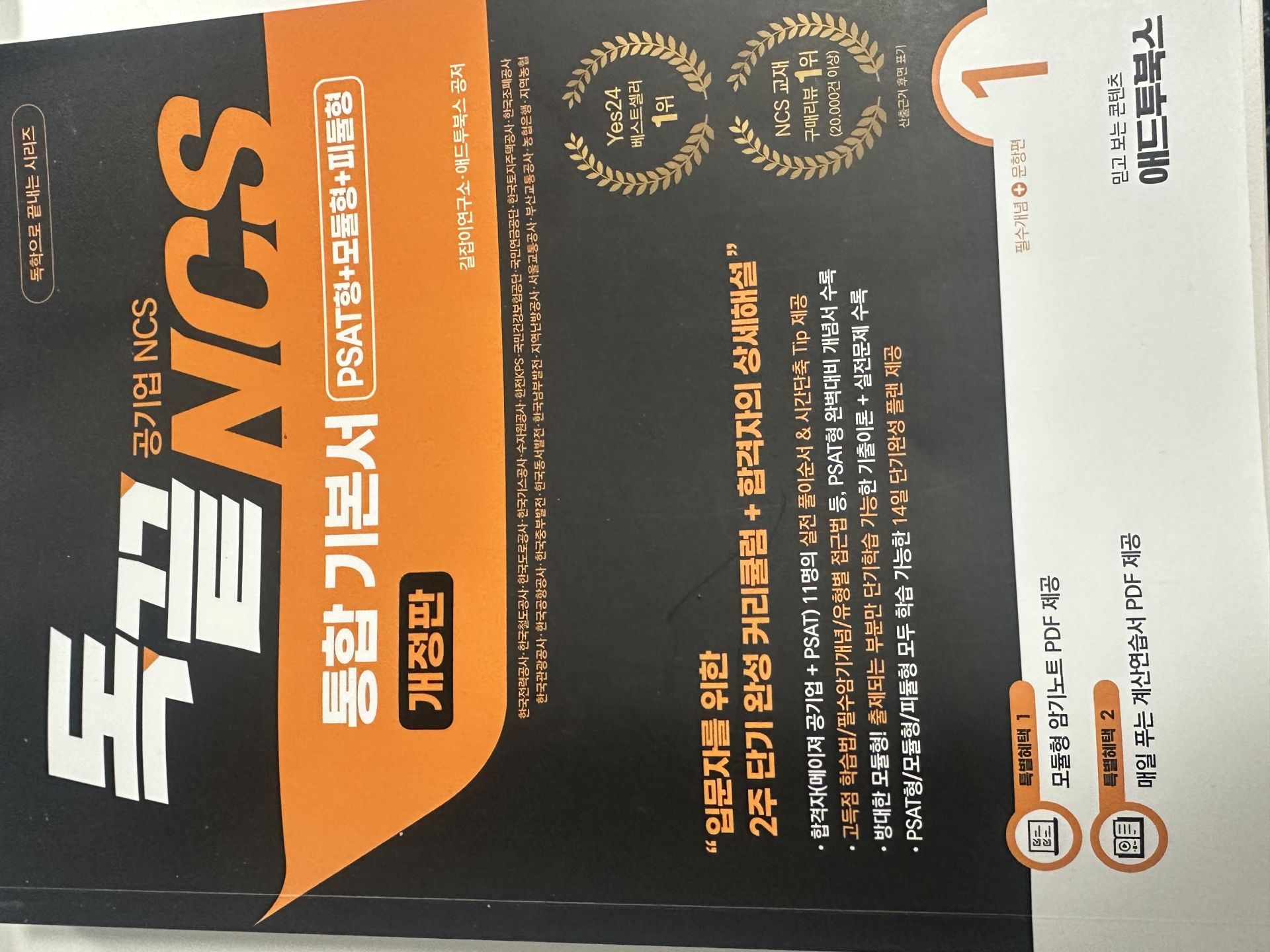 독끝 NCS 문제해결능력+자원관리능력을 사용해보고 좋아서 수리능력, 자료해석도 풀어봤다. 수많은 공겹 취준생들에게 혼자 독학하기에 정말 좋은 교재고 인강이라고하는데, 왜 그런지 지난번 문제해결능력+자원관리때도 느꼈지만 이번 수리능력, 자료해석 교재를 보면서도 또 느꼈다. 공기업 준비하는 독학러들에게 진짜 추천할만한 교재랑 인강이라고 생각된다. 공기업, PSAT 합격자의 NCS 문제풀이 시간단축 팁을 전체 문항에서 배울 수 있어 빠르게 답을 찾는 연습이 가능한 교재였다.