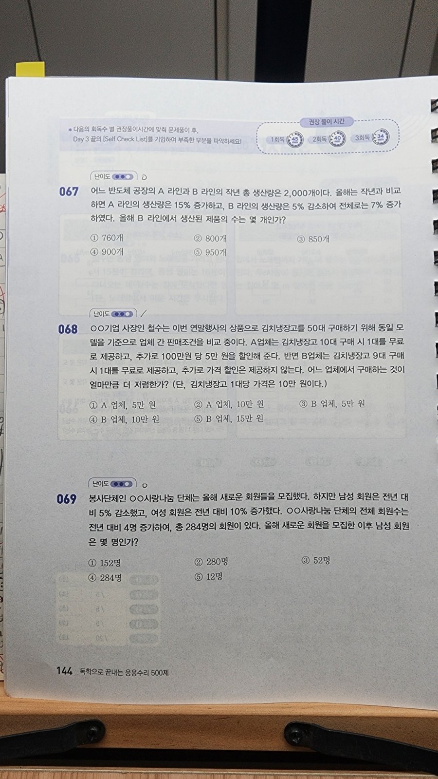 교재 구성도 실전 대비에 좋았습니다. 유형별로 포인트가 명확해서 복습할 때 “내가 어디서 막히는지” 체크가 쉽고, 강의 듣고 바로 교재로 반복하면 풀이 속도가 조금씩 올라가는 게 체감됩니다. 아직은 어렵게 느껴지는 부분도 있지만, 이번 주에 배운 유형들은 오답노트로 패턴 정리 → 같은 유형 2~3회 반복 → 시간 재면서 재풀이 방식으로 꾸준히 늘려갈 계획입니다.