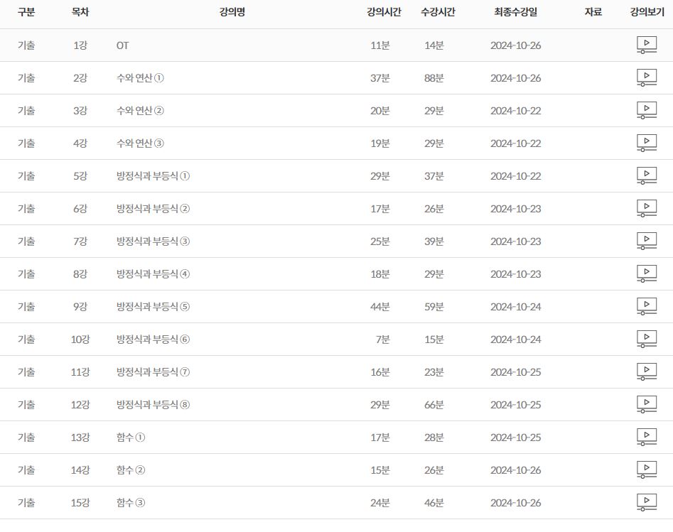 의수문자 전체 강의로 구매했고, 특히 수학은 쌩기초뷰터 잡아쥬셔서 너무 좋았습니다. 다른데가면 꿀팁이라고 알려주긴 하는데 그건 적용 가능한 범위가 너무 한종적이어서 특수한 상황에서만 적용되고 이런게 많더라고요. 박수옹 선생님은 기본기 기반으로 팁을 알려주셔서 그거 따라갔습니드. 쌤 덕분에 기초 잘 쌓았습니다.