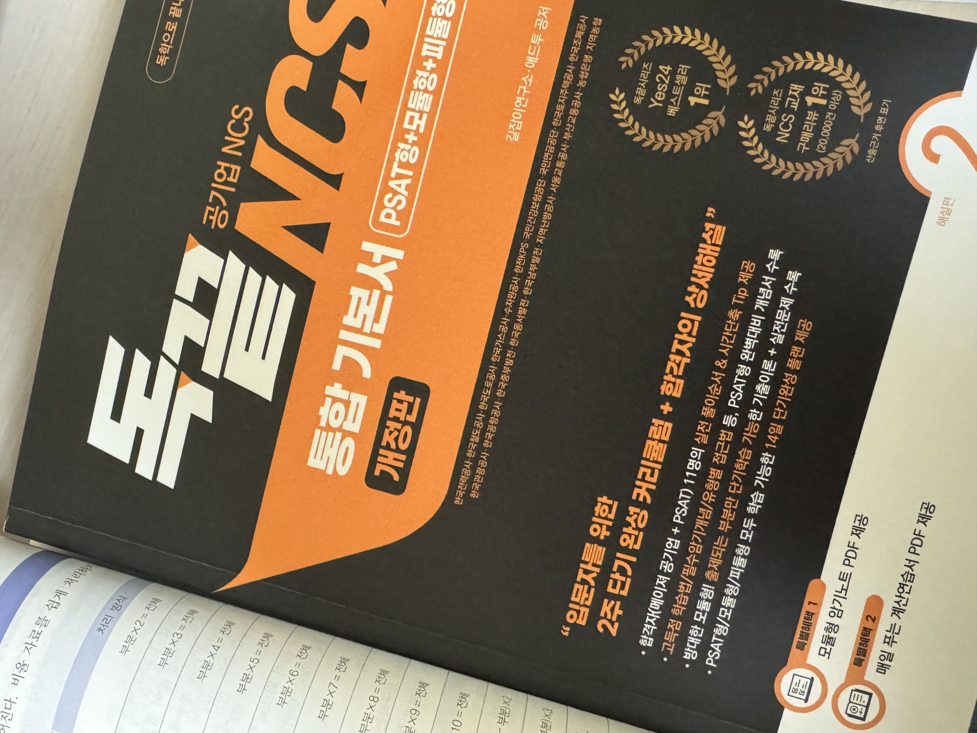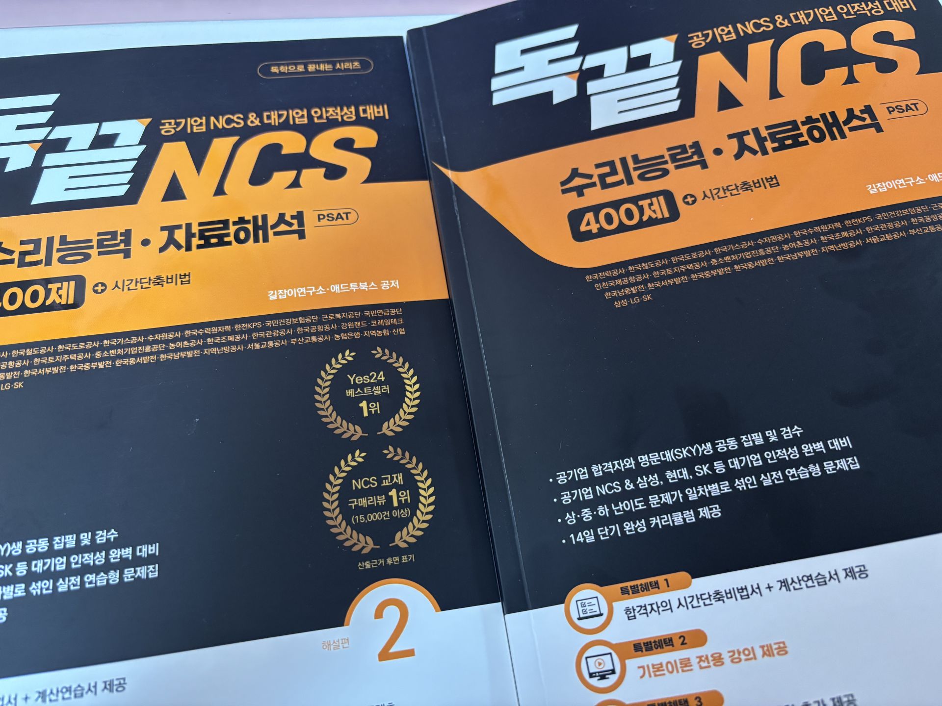 독끝 NCS 문제해결능력+자원관리능력을 사용해보고 좋아서 수리능력, 자료해석도 풀어봤다. 수많은 공겹 취준생들에게 혼자 독학하기에 정말 좋은 교재고 인강이라고하는데, 왜 그런지 지난번 문제해결능력+자원관리때도 느꼈지만 이번 수리능력, 자료해석 교재를 보면서도 또 느꼈다. 공기업 준비하는 독학러들에게 진짜 추천할만한 교재랑 인강이라고 생각된다. 공기업, PSAT 합격자의 NCS 문제풀이 시간단축 팁을 전체 문항에서 배울 수 있어 빠르게 답을 찾는 연습이 가능한 교재였다.