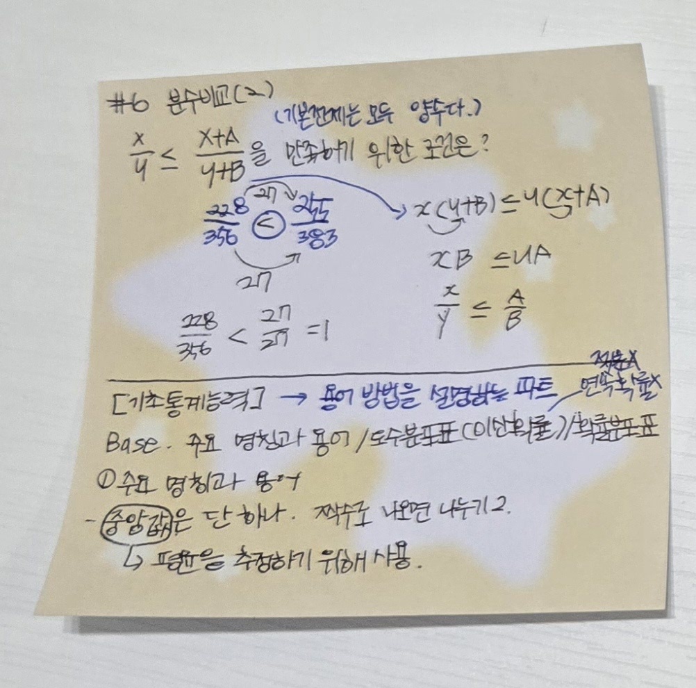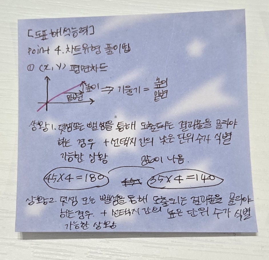 독끝 스터디 과정 2주차에는 박수웅 선생님과 '자료해석'과 '응용수리' 진도를 나갔습니다. 개인적으로 제일 취약하다고 생각하는 파트라 문제를 보기만하면 지레 겁부터 먹곤했는데, 선생님께서 알려주시는 풀이법을 하나하나씩 차근히 따라가다보니 생각보다 쉽게 풀릴 수 있다는 문제라는 점을 깨닫고 신선한 충격을 받은 적이 정말 많습니다... 괜히 명강의,명강사로 불리는 게 아니더라구요 ㅠㅠ bb
