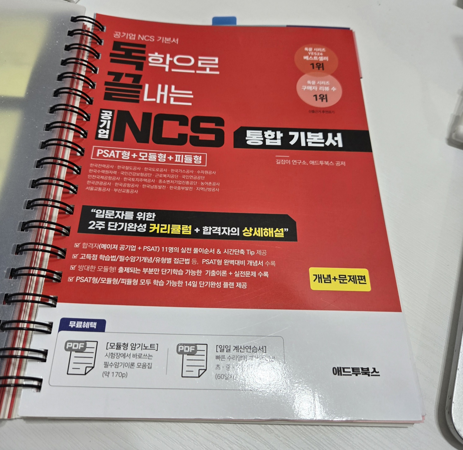 독끝 NCS 문제해결능력+자원관리능력을 사용해보고 좋아서 수리능력, 자료해석도 풀어봤다. 수많은 공겹 취준생들에게 혼자 독학하기에 정말 좋은 교재고 인강이라고하는데, 왜 그런지 지난번 문제해결능력+자원관리때도 느꼈지만 이번 수리능력, 자료해석 교재를 보면서도 또 느꼈다. 공기업 준비하는 독학러들에게 진짜 추천할만한 교재랑 인강이라고 생각된다. 공기업, PSAT 합격자의 NCS 문제풀이 시간단축 팁을 전체 문항에서 배울 수 있어 빠르게 답을 찾는 연습이 가능한 교재였다.