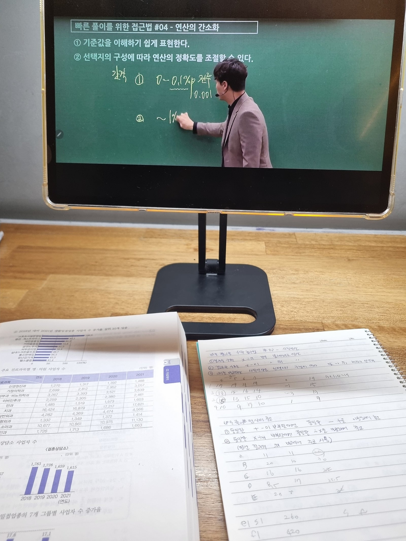 독끝 스터디 과정 2주차에는 박수웅 선생님과 '자료해석'과 '응용수리' 진도를 나갔습니다. 개인적으로 제일 취약하다고 생각하는 파트라 문제를 보기만하면 지레 겁부터 먹곤했는데, 선생님께서 알려주시는 풀이법을 하나하나씩 차근히 따라가다보니 생각보다 쉽게 풀릴 수 있다는 문제라는 점을 깨닫고 신선한 충격을 받은 적이 정말 많습니다... 괜히 명강의,명강사로 불리는 게 아니더라구요 ㅠㅠ bb