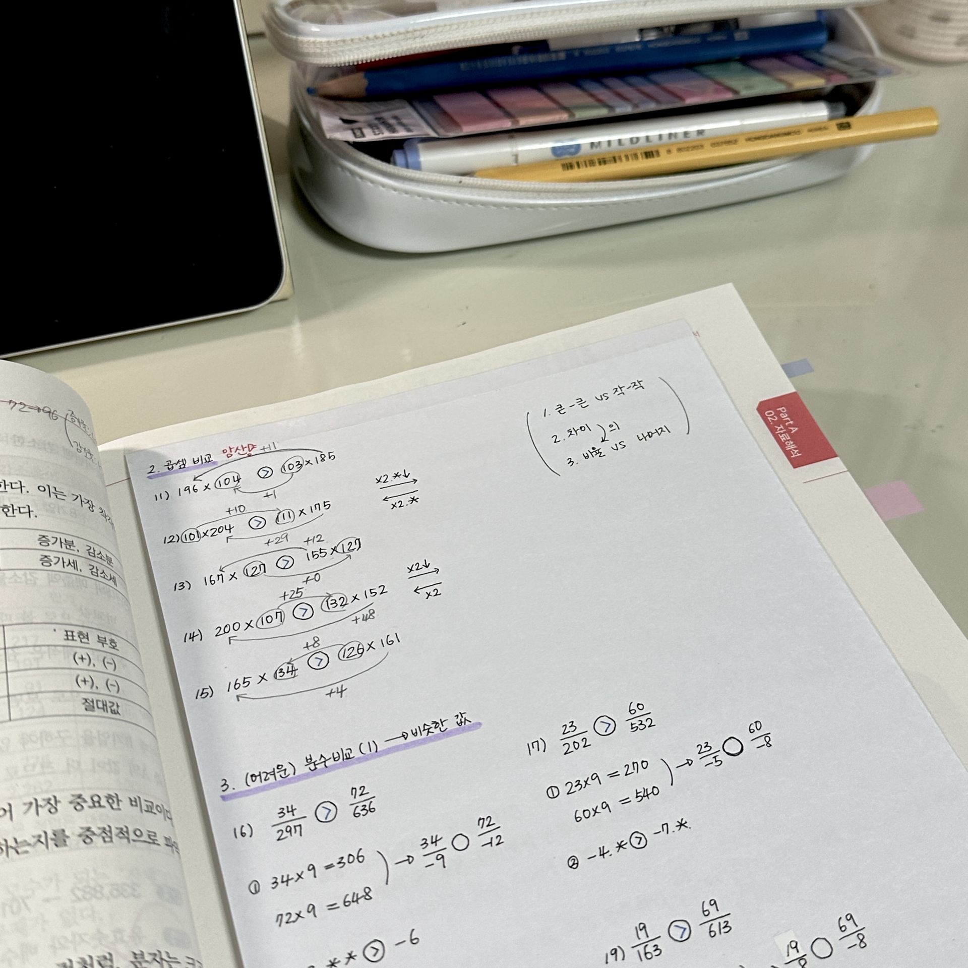 2주차 5일 동안 수업을 들으며 느낀 후기를 남겨봅니다. 이전에 기초수학 강의를 만족스럽게 들었던 경험이 있어서, 이번에는 꼭 응용수리 문제풀이까지 이어서 완강해 보자는 목표로 시작하게 되었습니다. 사실 2024년에 문제집을 먼저 구매해 두었지만 혼자 풀다 보니 정답지에 의존하게 되고, 풀이 방향을 잡지 못해 답답함을 많이 느꼈던 기억이 있습니다. 그런데 강의를 함께 병행하니 문제 접근 방식이 훨씬 명확해졌고, 단순히 정답을 맞히는 것이 아니라 “왜 이렇게 풀어야 하는지” 이해할 수 있게 된 점이 가장 큰 변화였습니다. 특히 해설지에는 없는 다양한 풀이 방법이나 시간을 단축할 수 있는 팁을 알려주신 부분이 정말 도움이 되었습니다. 문제를 바라보는 시각 자체가 조금씩 달라지고 있다는 느낌도 받았습니다.