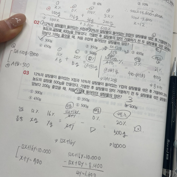 수웅쌤 강의의 가장 큰 장점은 첫째, 실전적인 시간 단축 비법을 전수해주신다는 것입니다. 정석적인 방정식을 써서 길게 계산하는 방식이 아니라 대입법, 가감법, ⭐️몰아주기, 간소화⭐️등 강의를 들은 사람만 아는 꿀팁들을 가르쳐주십니다. 특히 몰아주기와 간소화 기법을 체화하면 복잡한 수치도 암산으로 처리할 수 있을 만큼 계산이 단순해집니다.