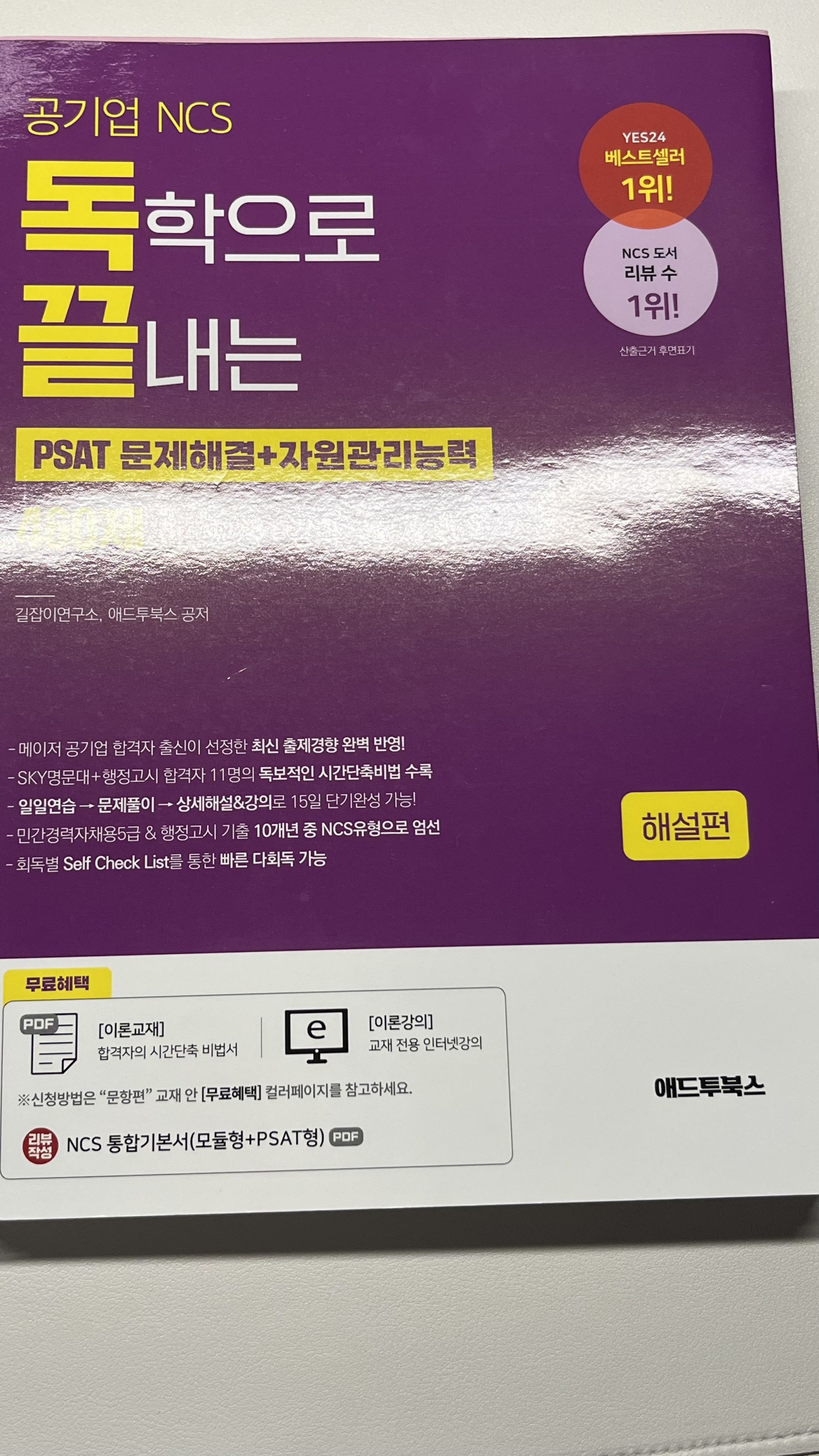 독끝 NCS 문제해결능력+자원관리능력을 사용해보고 좋아서 수리능력, 자료해석도 풀어봤다. 수많은 공겹 취준생들에게 혼자 독학하기에 정말 좋은 교재고 인강이라고하는데, 왜 그런지 지난번 문제해결능력+자원관리때도 느꼈지만 이번 수리능력, 자료해석 교재를 보면서도 또 느꼈다. 공기업 준비하는 독학러들에게 진짜 추천할만한 교재랑 인강이라고 생각된다. 공기업, PSAT 합격자의 NCS 문제풀이 시간단축 팁을 전체 문항에서 배울 수 있어 빠르게 답을 찾는 연습이 가능한 교재였다.