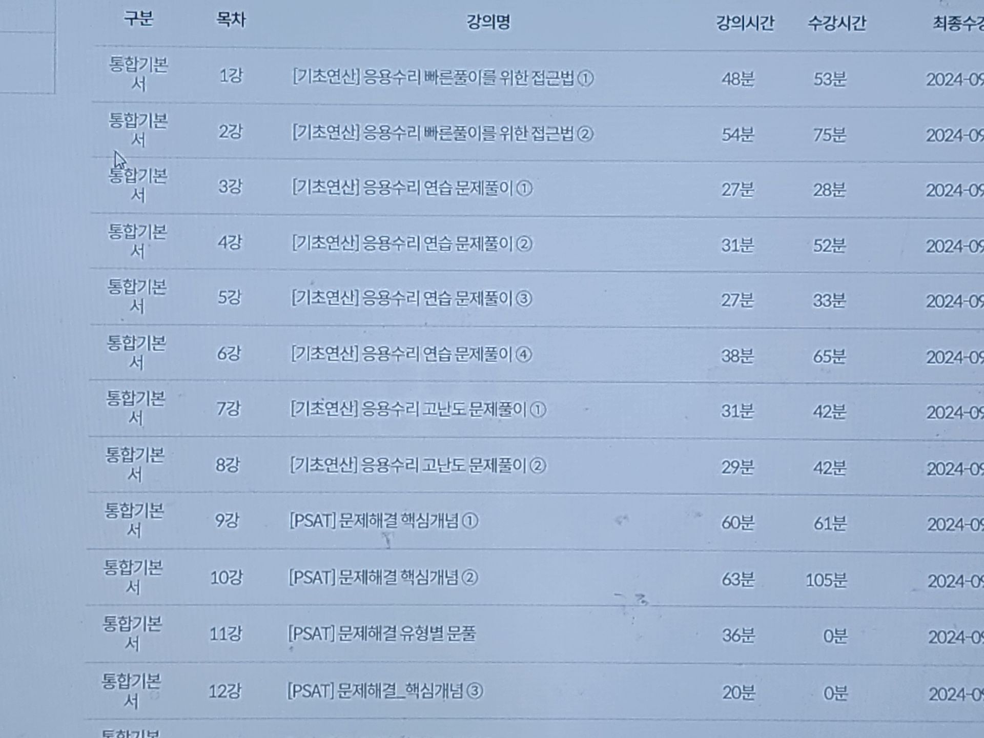 2주차 5일 동안 수업을 들으며 느낀 후기를 남겨봅니다. 이전에 기초수학 강의를 만족스럽게 들었던 경험이 있어서, 이번에는 꼭 응용수리 문제풀이까지 이어서 완강해 보자는 목표로 시작하게 되었습니다. 사실 2024년에 문제집을 먼저 구매해 두었지만 혼자 풀다 보니 정답지에 의존하게 되고, 풀이 방향을 잡지 못해 답답함을 많이 느꼈던 기억이 있습니다. 그런데 강의를 함께 병행하니 문제 접근 방식이 훨씬 명확해졌고, 단순히 정답을 맞히는 것이 아니라 “왜 이렇게 풀어야 하는지” 이해할 수 있게 된 점이 가장 큰 변화였습니다. 특히 해설지에는 없는 다양한 풀이 방법이나 시간을 단축할 수 있는 팁을 알려주신 부분이 정말 도움이 되었습니다. 문제를 바라보는 시각 자체가 조금씩 달라지고 있다는 느낌도 받았습니다.
