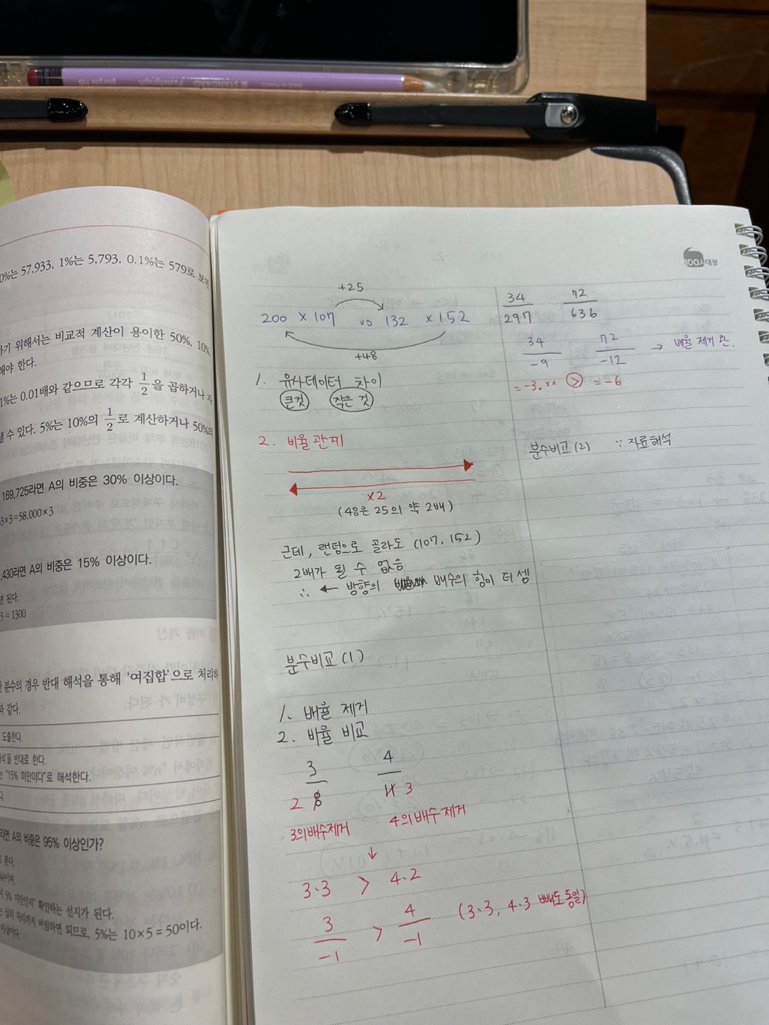 독끝 스터디 과정 2주차에는 박수웅 선생님과 '자료해석'과 '응용수리' 진도를 나갔습니다. 개인적으로 제일 취약하다고 생각하는 파트라 문제를 보기만하면 지레 겁부터 먹곤했는데, 선생님께서 알려주시는 풀이법을 하나하나씩 차근히 따라가다보니 생각보다 쉽게 풀릴 수 있다는 문제라는 점을 깨닫고 신선한 충격을 받은 적이 정말 많습니다... 괜히 명강의,명강사로 불리는 게 아니더라구요 ㅠㅠ bb