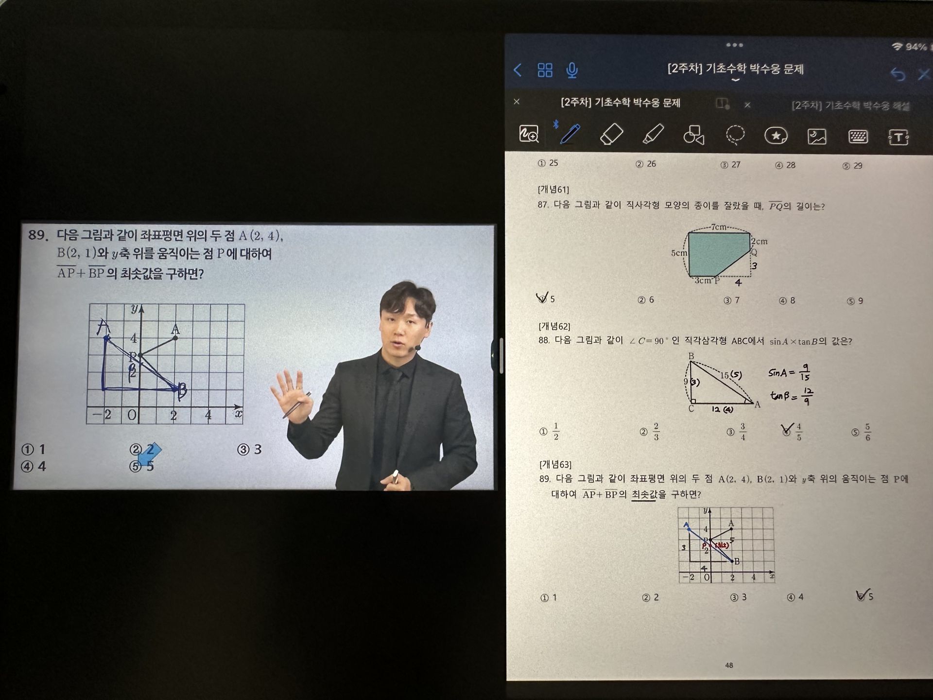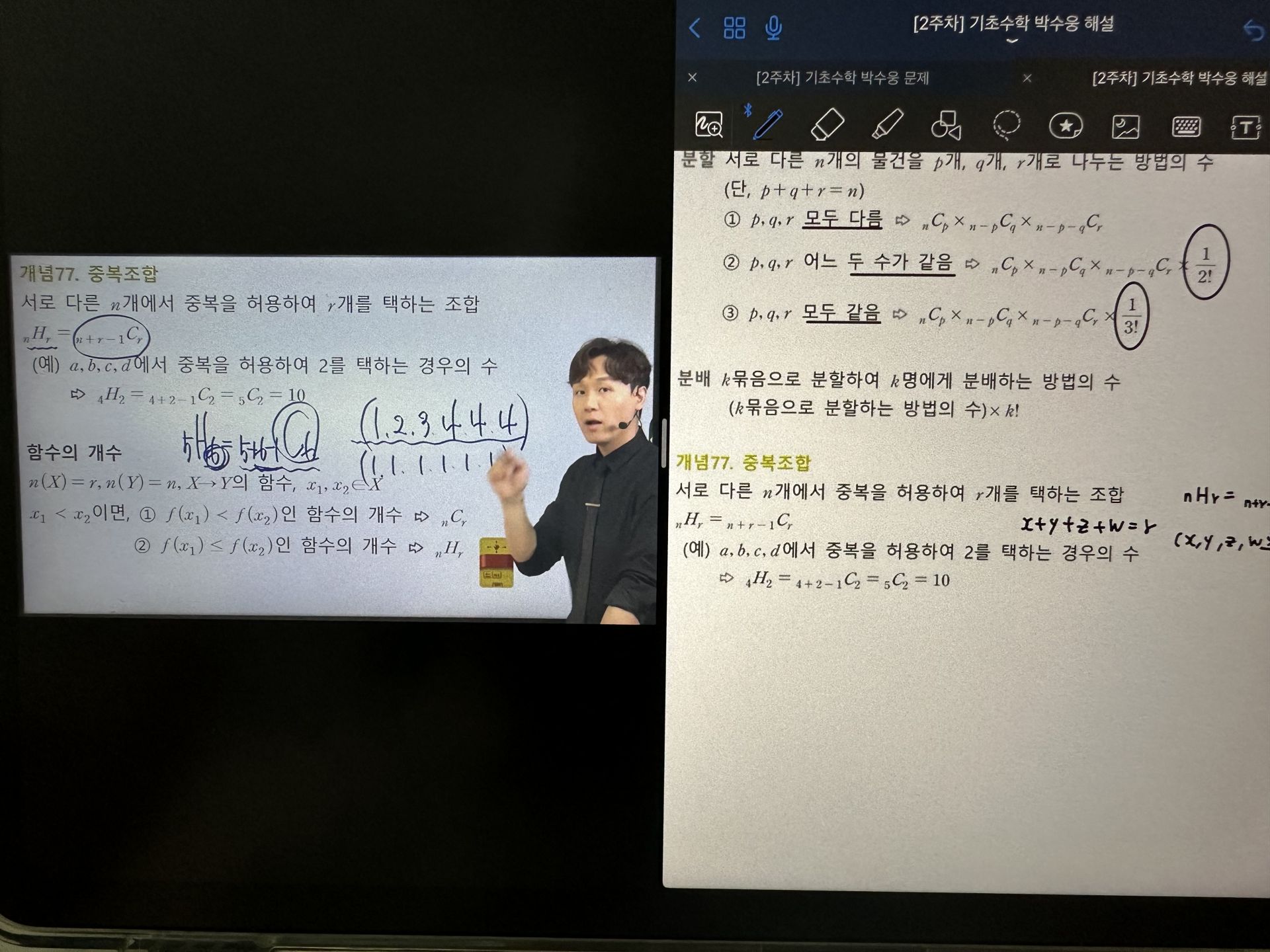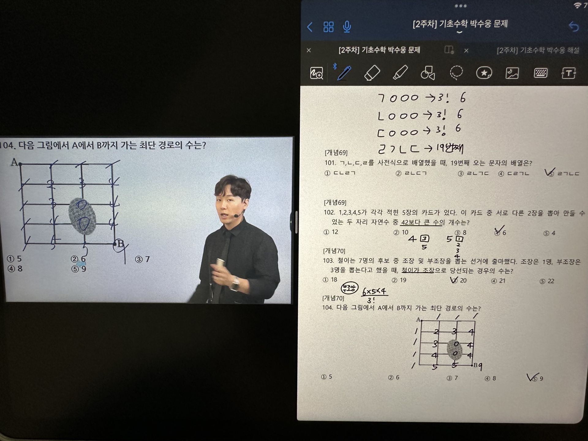 다시 풀어보라는 문제는 일시정지 하고 다시 풀어보았고 선생님 풀이법과 비교해보았습니다.