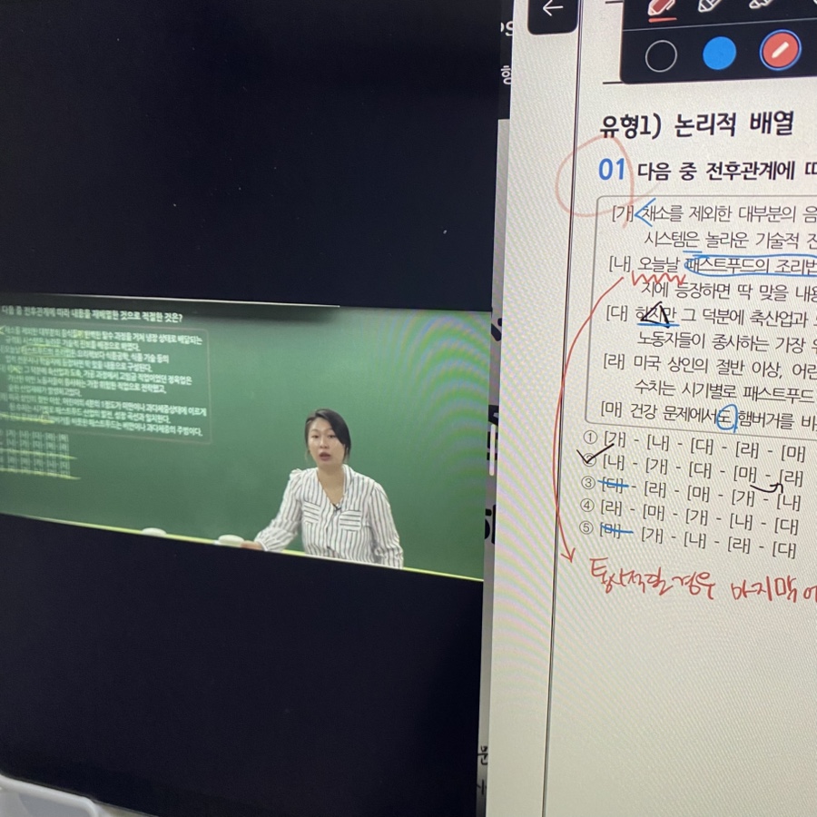 강의는 선생님 딕션이 좋아서 또박또박 잘 들리고, 교재를 화면에 꽉 띄운채 화면공유를 하는 형식으로 진행돼 과외받는 느낌도 들었고 편했다. 또 판서해주는대로 따라가다보면 쉽고 확실하게 내용을 습득할 수 있었다. 교재 해설에는 없는 여러 팁들이나 스킬도 배울 수 있고 더 빠르게 이해할 수 있는데다가 다양한 접근법도 배울 수 있으니 교재와 강의를 같이 활용하는게 좋을 것 같다.