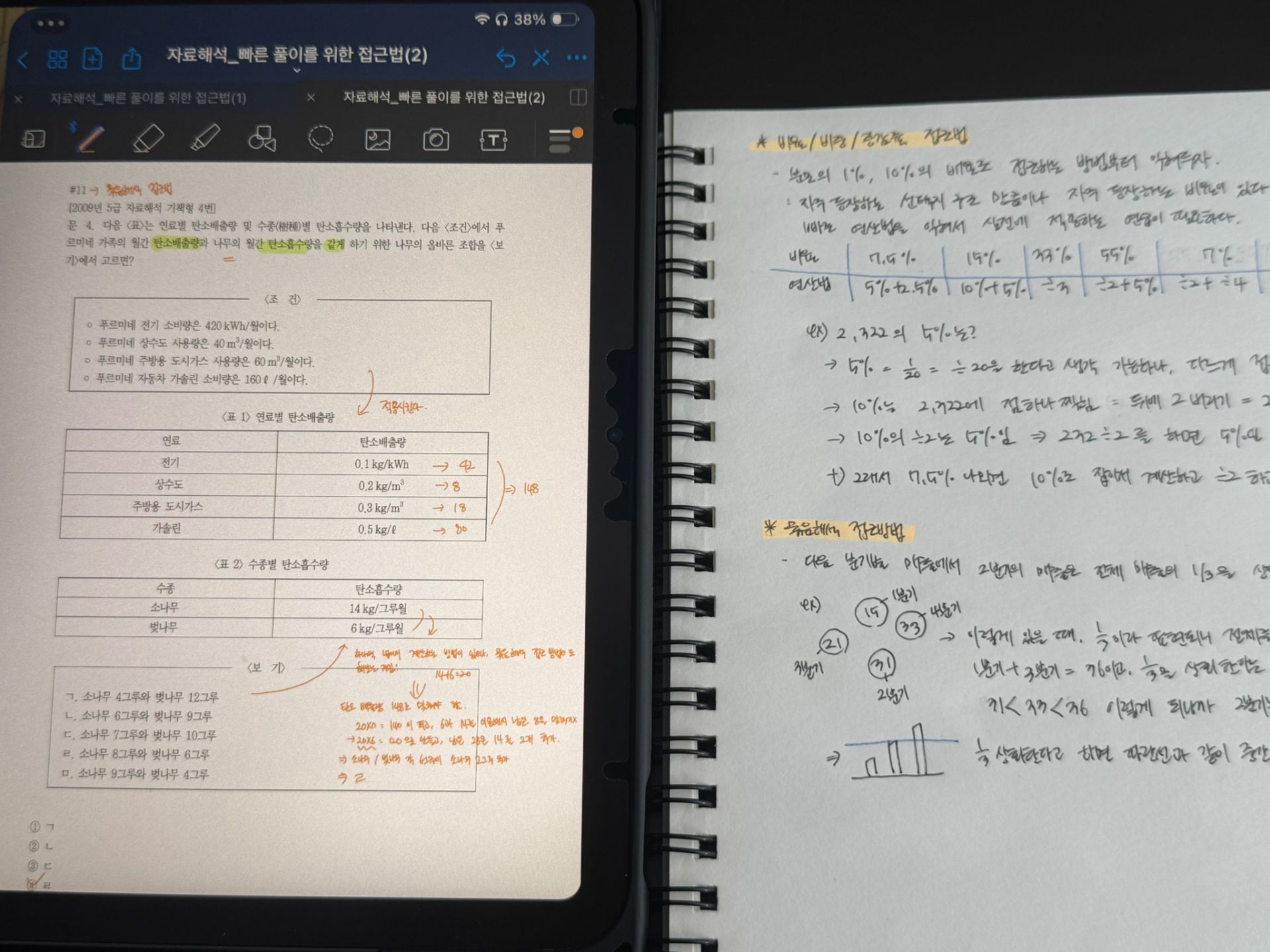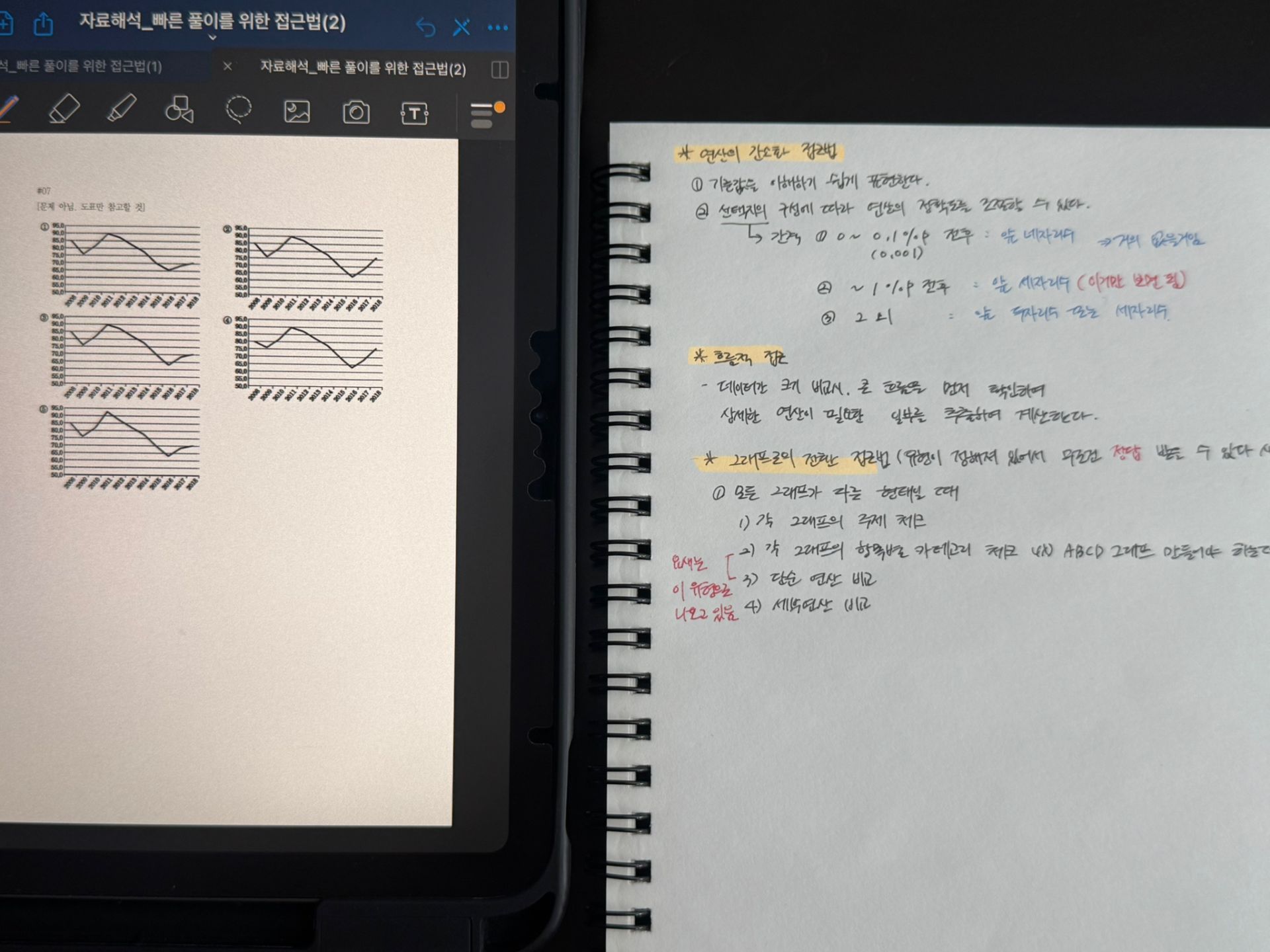 독끝 스터디 과정 2주차에는 박수웅 선생님과 '자료해석'과 '응용수리' 진도를 나갔습니다. 개인적으로 제일 취약하다고 생각하는 파트라 문제를 보기만하면 지레 겁부터 먹곤했는데, 선생님께서 알려주시는 풀이법을 하나하나씩 차근히 따라가다보니 생각보다 쉽게 풀릴 수 있다는 문제라는 점을 깨닫고 신선한 충격을 받은 적이 정말 많습니다... 괜히 명강의,명강사로 불리는 게 아니더라구요 ㅠㅠ bb
