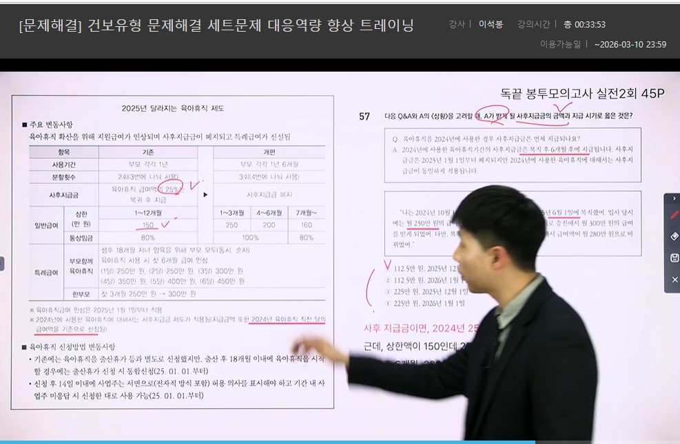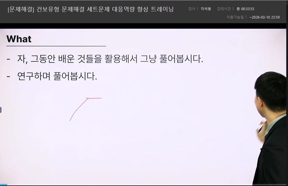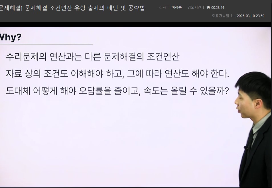 교재 또한 인강 내용과 잘 연계되어 있어 복습하기에 매우 좋았습니다. 유형별로 정리가 되어 있어 강의를 들은 뒤 바로 해당 유형 문제를 풀어볼 수 있었고, 풀이 과정을 다시 확인하며 스스로 부족한 부분을 점검하기에 적합했습니다. 저는 강의를 수강한 후 교재 문제를 풀면서, 강의에서 강조한 포인트를 체크하고 풀이 시간을 함께 기록하는 방식으로 공부하고 있습니다. 이를 통해 불필요하게 시간이 오래 걸리는 지점을 스스로 확인할 수 있었습니다.
