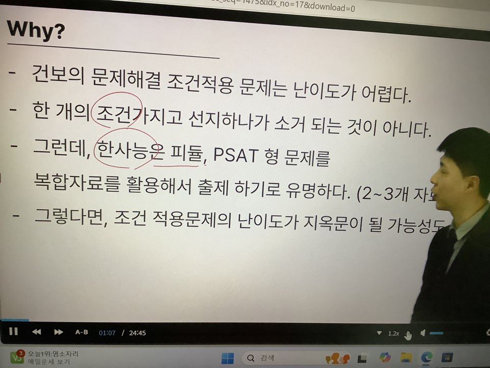 강의는 단순히 문제 풀이를 반복하는 방식이 아니라 자주 출제되는 유형을 중심으로 최적의 풀이 순서와 사고 흐름을 정립해 주는 실전형 커리큘럼으로 구성되어 있었습니다. 무작정 모든 선지를 다 따져보려던 기존의 나쁜 습관을 버리고, 필요한 조건부터 걸러서 적용하는 '읽는 순서'의 기술을 전수해 주어 풀이를 한결 깔끔하게 만들어 주었습니다. 또한 다양한 풀이 팁과 정답 판별 기준은 손이 멈추는 시간을 획기적으로 줄여주었습니다. 특히 경로 문제나 추론 유형을 다룬 심화 강의는 복잡한 구조를 유형화하여 무작정 계산이나 답 찾기 시도부터 하던 저의 나쁜 습관을 완전히 고쳐놓았습니다.