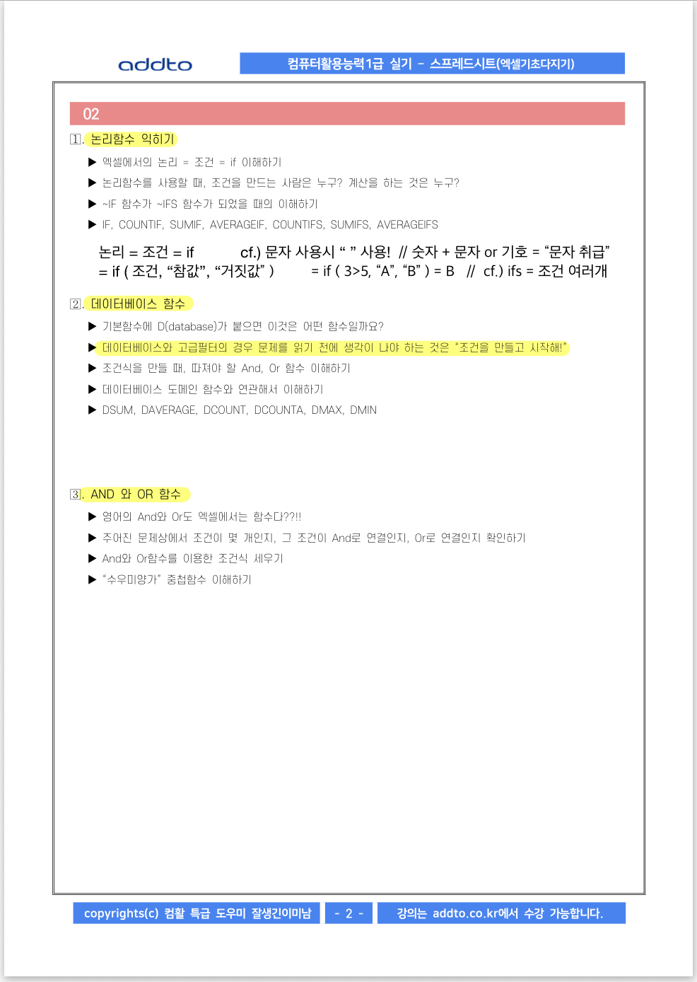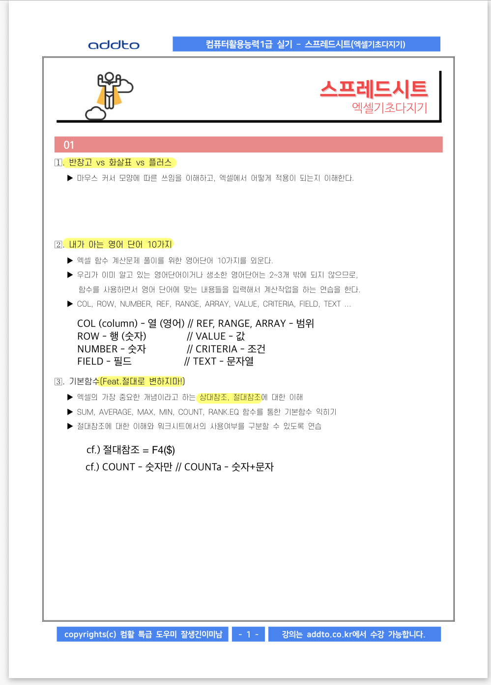 이러한 내용들을 타 인강들과 비교했고 결국 한정된 자원 안에 선택한 건 "애드투 이미남 컴퓨터활용능력 1급 인강"입니다! 주변에 같이 컴활 준비하는 친구들한테도 홍보하고 있고, 타 인강 듣는 친구들의 불편을 토로하는 걸 듣고 있으면 저는 정말 잘한 선택을 했더라고요! 강추강추합니다!
