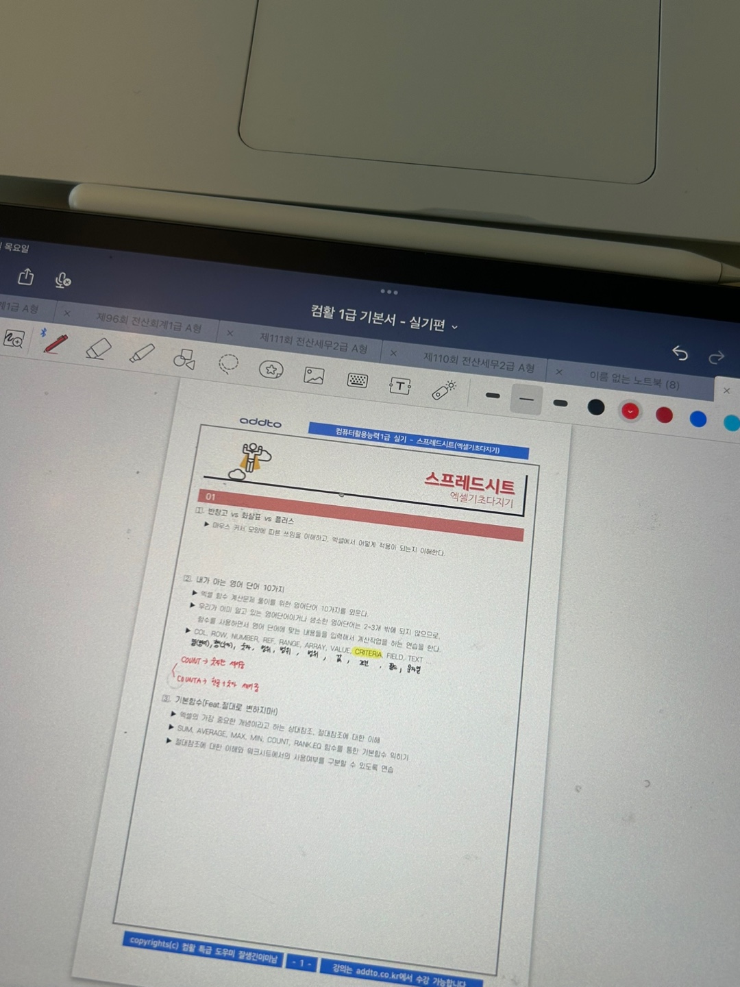 특히 액세스는 처음 들어서 처음에 따라가기 너무 힘든 거에요. 그래서 교재를 하나는 필기 있는 버전, 하나는 필기 없는 버전으로 해서 처음에 할 때는 필기 마구마구해서 밖에서도 쉽게 볼 수 있게 메모를 했구요. 하나는 필기 없는 버전으로 해서 실전처럼 연습할 때 패드 세로로 세운 후에 시험장처럼 연습했습니다!