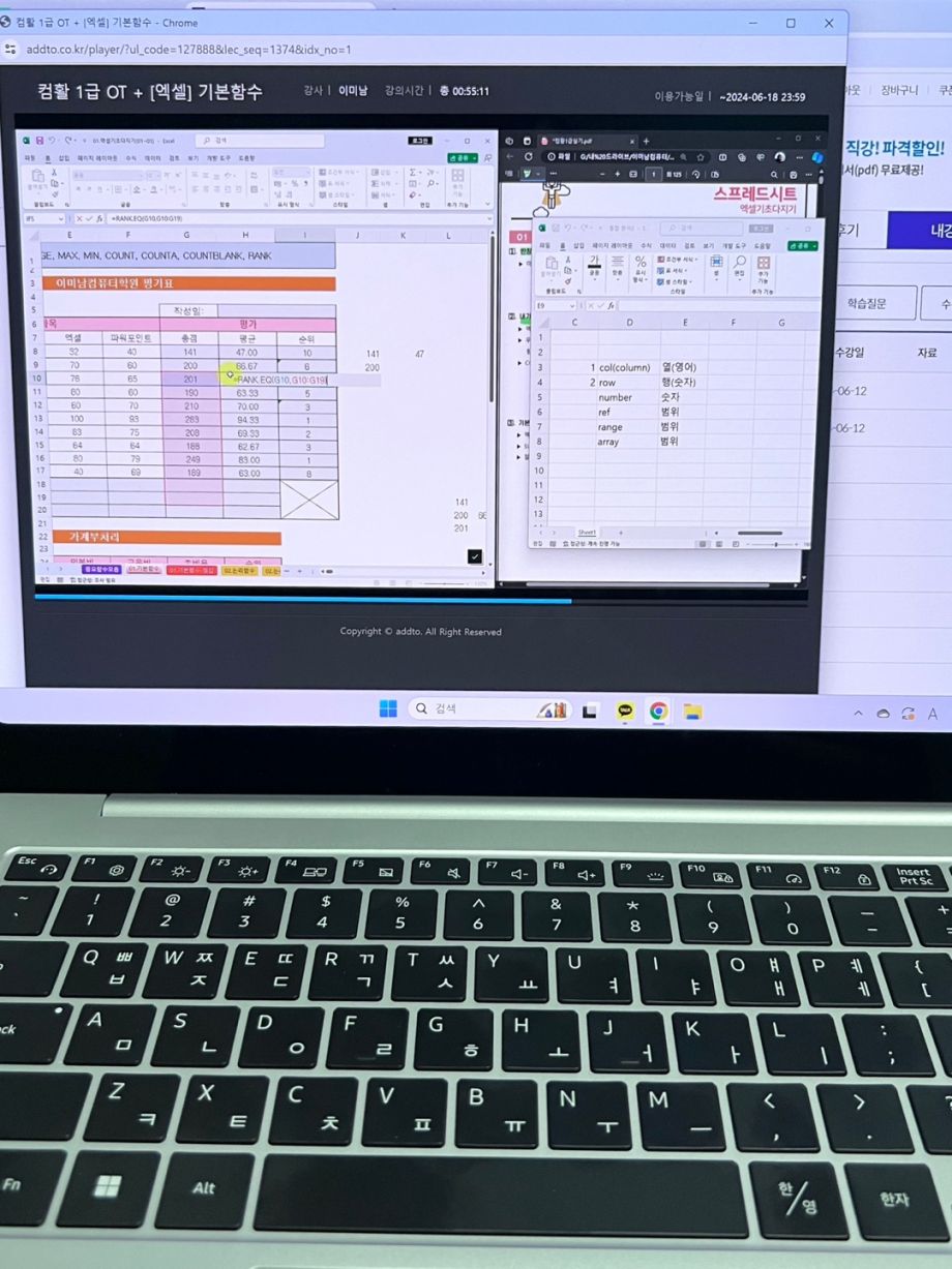 그래서인지 필기를 합격하고 독학으로 실기 준비하다보니 함수라는 거대한 벽에 막혀 미루고 미뤄 필기 합격 유예기간 15일 남기고 부랴부랴 "애드투 이미남 강사님의 컴활 2급 실기" 강의를 듣게 되었어요. (포기하기엔 필기 합격이 너무 아깝잖아요...ㅠ)