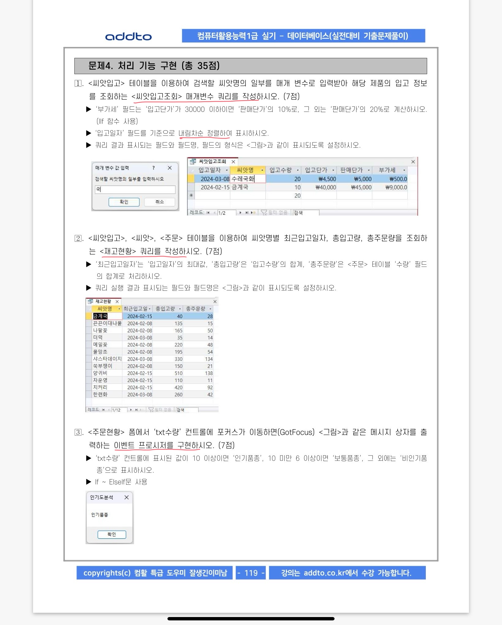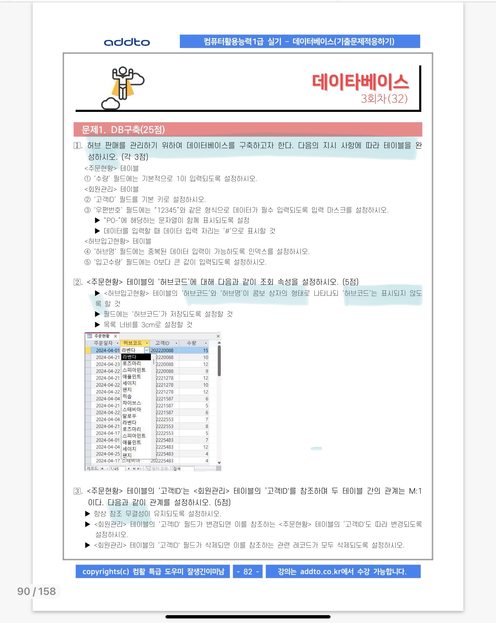 특히 액세스는 처음 들어서 처음에 따라가기 너무 힘든 거에요. 그래서 교재를 하나는 필기 있는 버전, 하나는 필기 없는 버전으로 해서 처음에 할 때는 필기 마구마구해서 밖에서도 쉽게 볼 수 있게 메모를 했구요. 하나는 필기 없는 버전으로 해서 실전처럼 연습할 때 패드 세로로 세운 후에 시험장처럼 연습했습니다!