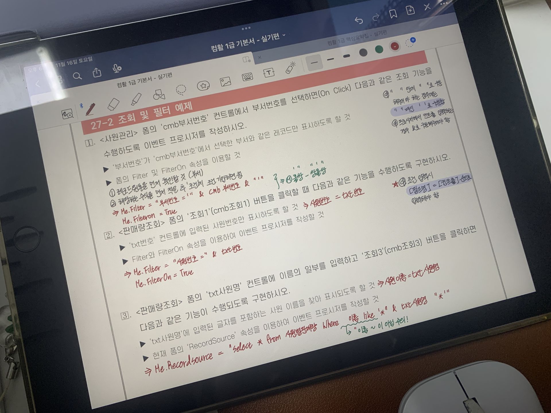 특히 액세스는 처음 들어서 처음에 따라가기 너무 힘든 거에요. 그래서 교재를 하나는 필기 있는 버전, 하나는 필기 없는 버전으로 해서 처음에 할 때는 필기 마구마구해서 밖에서도 쉽게 볼 수 있게 메모를 했구요. 하나는 필기 없는 버전으로 해서 실전처럼 연습할 때 패드 세로로 세운 후에 시험장처럼 연습했습니다!