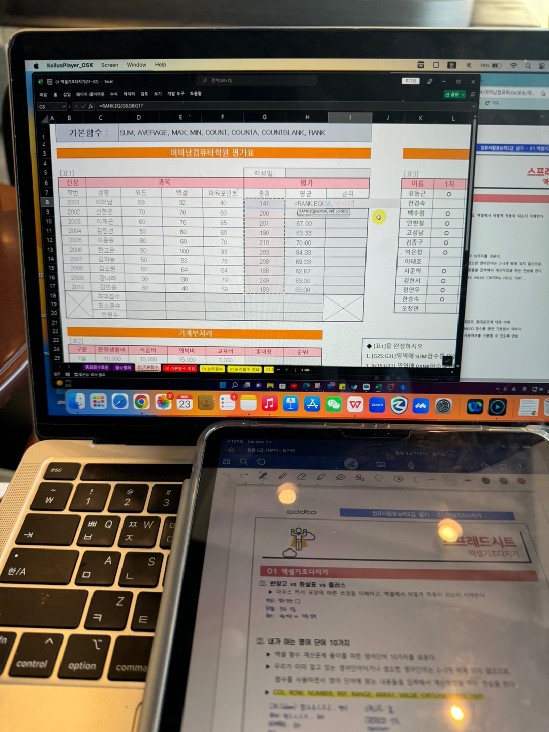저는 이미남선생님의 컴활2급 필기+실기 강의를 수강하였는데요! 일단 수강 전에 제 실력은 엑셀이라고는 한번도 다뤄본 적도 없을뿐더러, 컴퓨터 관련되서는 정말 기초부터 시작하는 상황이였습니다. 강의 초반에 필기 이전에 실기강의 3개정도를 들은 후에 필기강의가 시작됩니다. 강의를 들으며 엑셀의 기본인 행과 열 정의부터 시작하여 자주 사용되는 단어, 함수 계산법 등 중간중간 멈춘 후에 노트에 필기를 하며 들었습니다. 그러다보면 초반엔 아무래도 좀 시간이 들었지만 이후에복습을 하며 익히기도 했고 강의 중간중간 중요한 부분은 계속 해서 강사님이 반복해 말씀해주시기에 수월하게 공부할 수 있었어요! 워낙에 개념설명도 꼼꼼하게 잘 해주시고 놓치거나 까먹었던 부분이 있으면 강의를 듣다보면 귀에 콕콕 잘박혀서 따로 막 암기할 필요도 없던 것 같아요ㅎㅎ