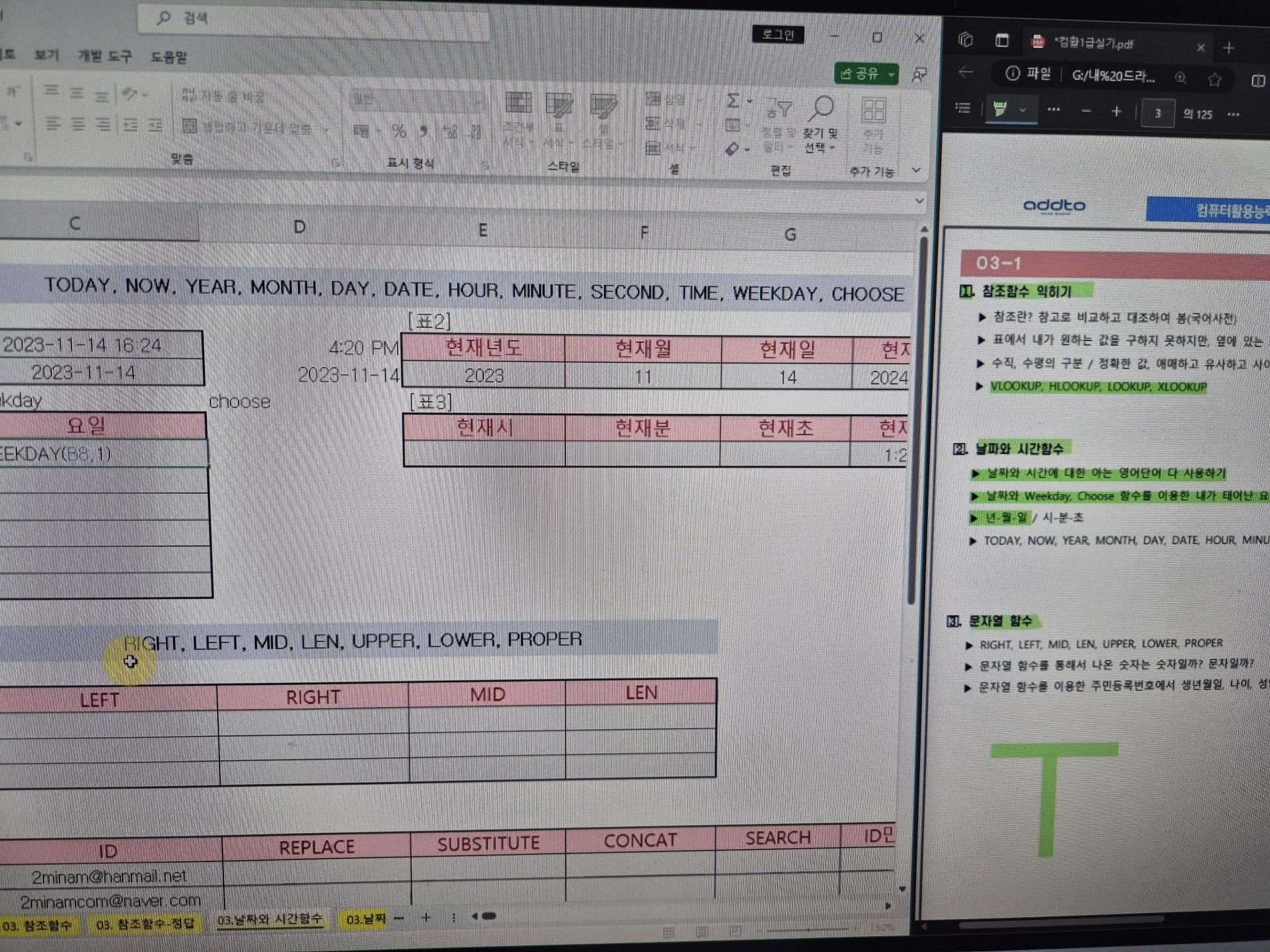 함수는 엑셀에서 학습을 했던 것이라 엑셀과 비교해서 잘 설명해주시는 이미남 선생님의 강의를 따라가며