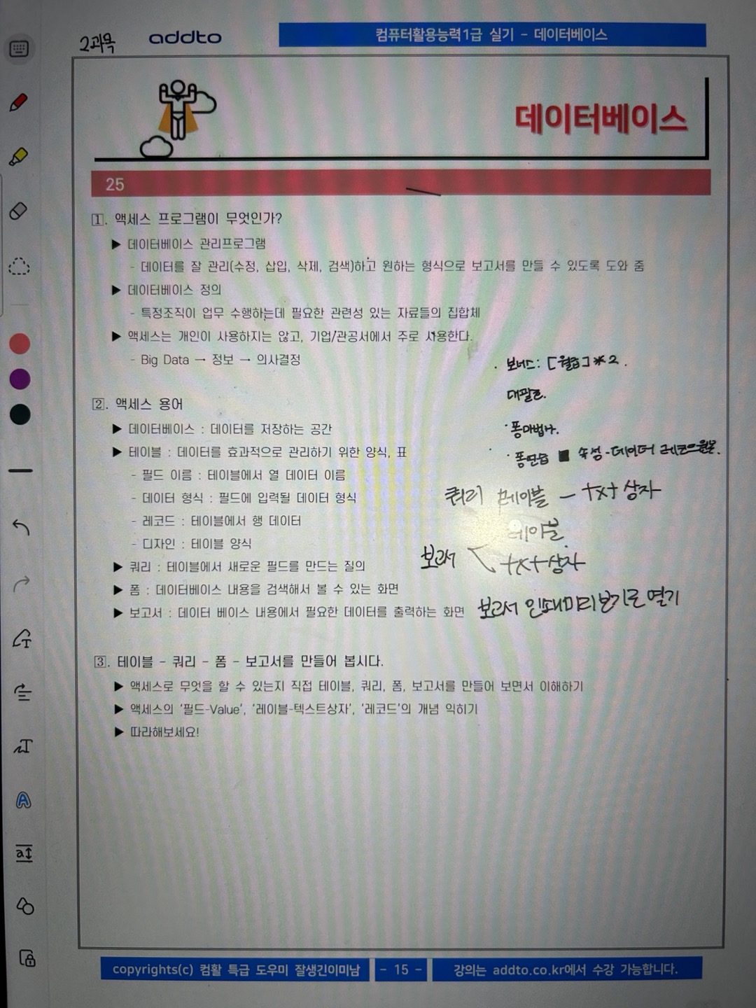 특히 액세스는 처음 들어서 처음에 따라가기 너무 힘든 거에요. 그래서 교재를 하나는 필기 있는 버전, 하나는 필기 없는 버전으로 해서 처음에 할 때는 필기 마구마구해서 밖에서도 쉽게 볼 수 있게 메모를 했구요. 하나는 필기 없는 버전으로 해서 실전처럼 연습할 때 패드 세로로 세운 후에 시험장처럼 연습했습니다!