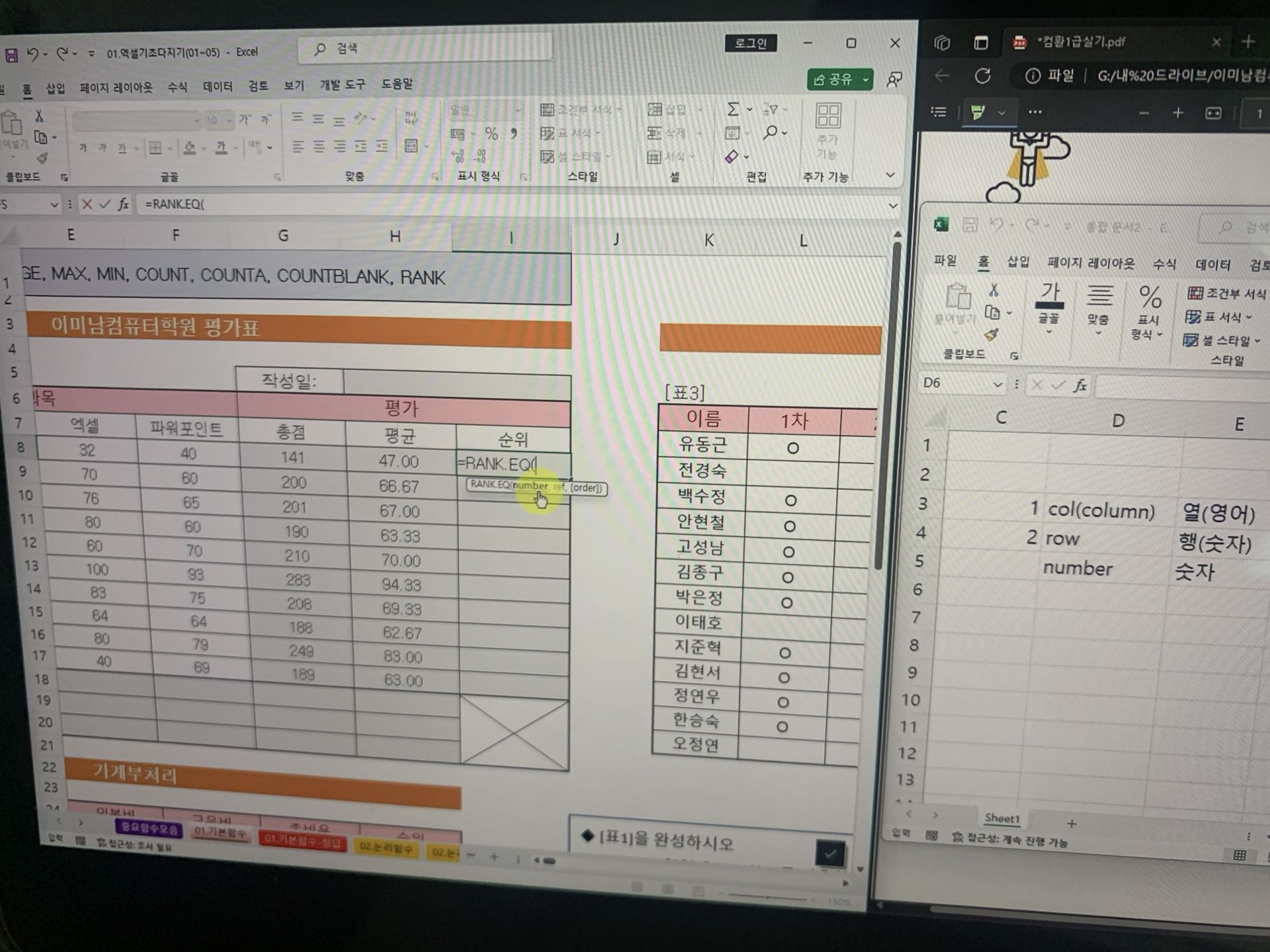 [애드투 이미남 컴퓨터활용능력 1급 실기] 컴퓨터활용 1급 [엑셀] 10강~12강(10/30) 수강했습니다.10강, 11강은 무난하게 들었는데 확실히 계산문제 적응하기1 강의부터