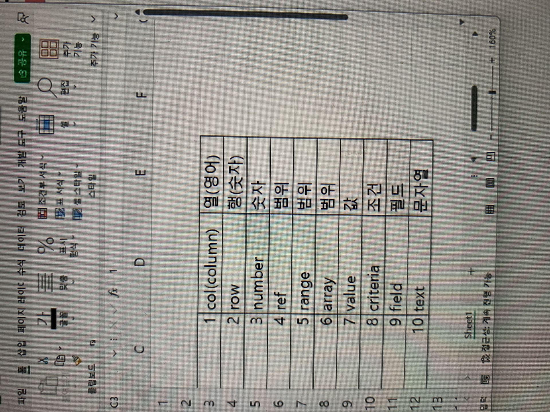 -col(열), row(행), number(숫자), ref/range/array(범위: 반창고 모양으로 선택), value(값), criteria(조건), field(필드), text(문자열)