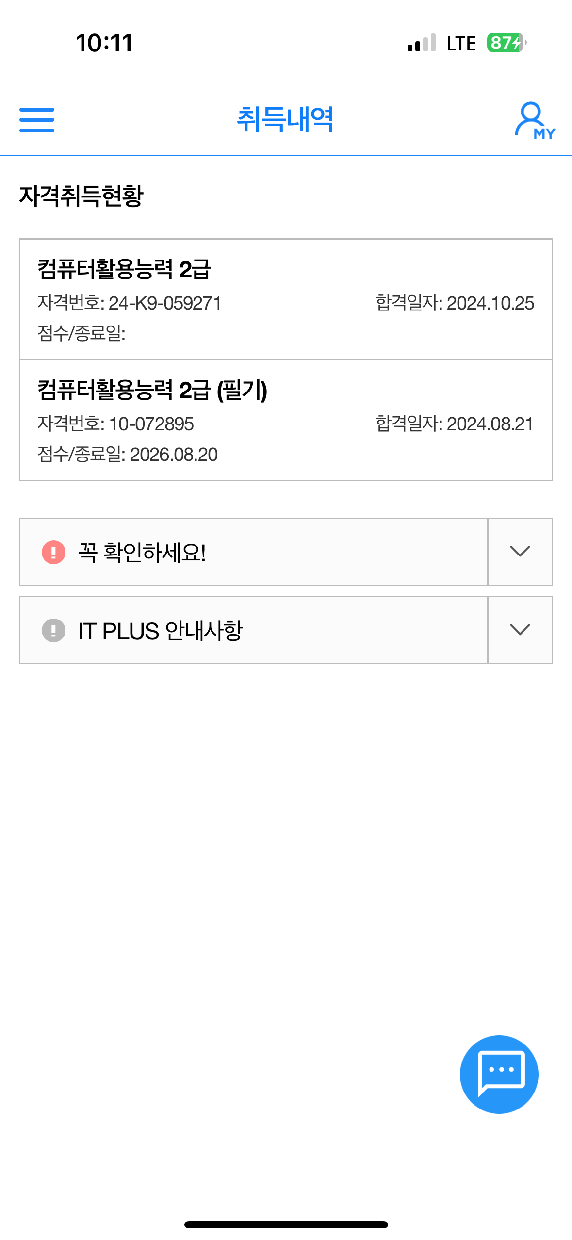 알게 되었고 바로 결재하여 온라인 강의를 듣기 시작했습니다. 이번이 마지막이다 라는 생각을 가지고 컴퓨터 활용 능력 2급 필기 시험을 5번째 보게 되었습니다. 그 결과는 합격이였습니다. 이로인해 네이버 블로그와 유튜브에서 말하는 독학은 어렵구나라는 걸 알게 되었고