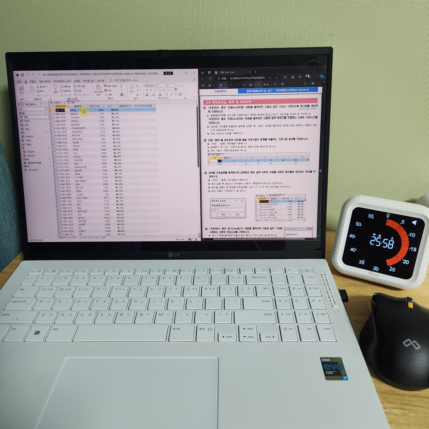 특히 액세스는 처음 들어서 처음에 따라가기 너무 힘든 거에요. 그래서 교재를 하나는 필기 있는 버전, 하나는 필기 없는 버전으로 해서 처음에 할 때는 필기 마구마구해서 밖에서도 쉽게 볼 수 있게 메모를 했구요. 하나는 필기 없는 버전으로 해서 실전처럼 연습할 때 패드 세로로 세운 후에 시험장처럼 연습했습니다!