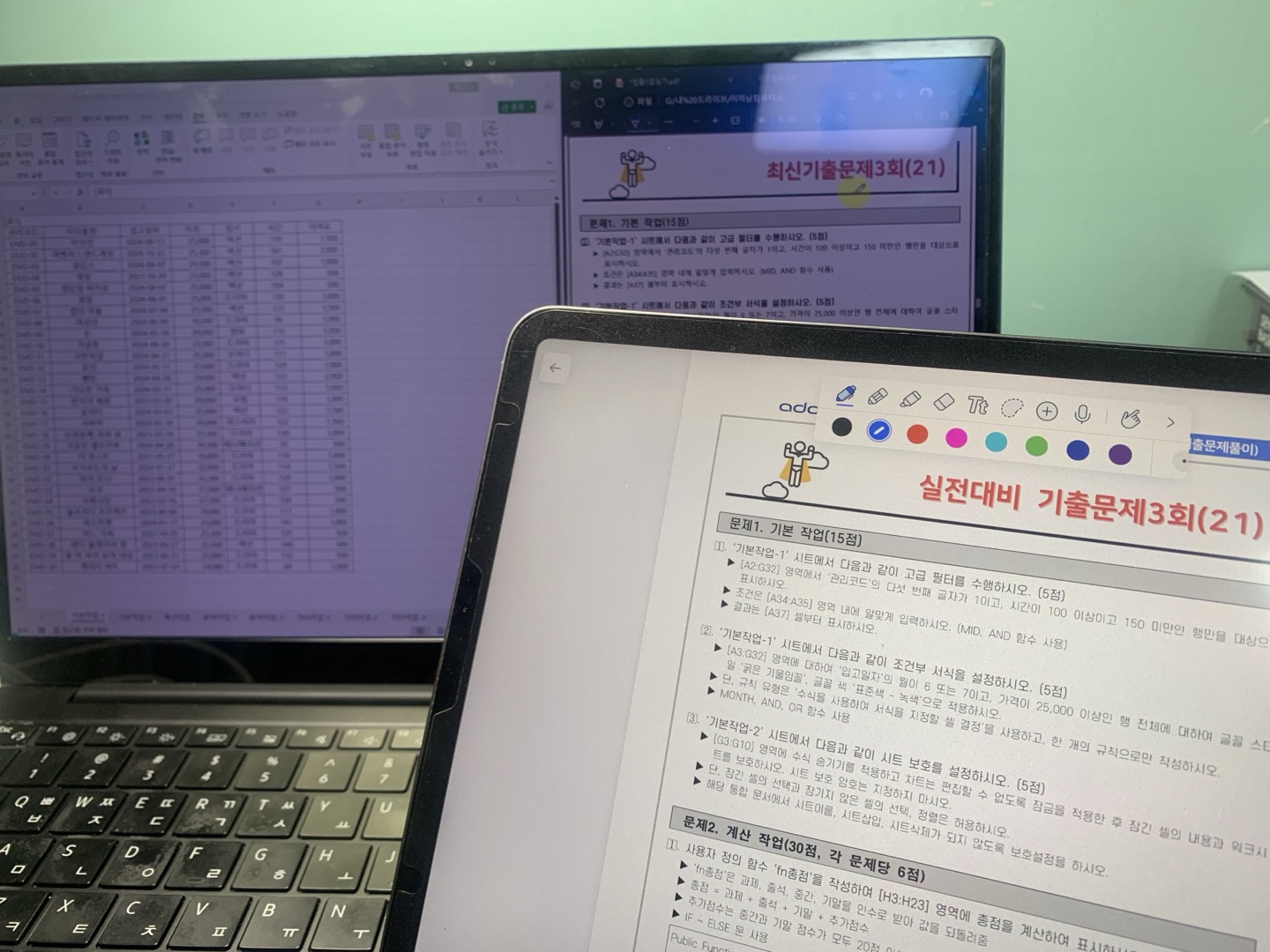 특히 액세스는 처음 들어서 처음에 따라가기 너무 힘든 거에요. 그래서 교재를 하나는 필기 있는 버전, 하나는 필기 없는 버전으로 해서 처음에 할 때는 필기 마구마구해서 밖에서도 쉽게 볼 수 있게 메모를 했구요. 하나는 필기 없는 버전으로 해서 실전처럼 연습할 때 패드 세로로 세운 후에 시험장처럼 연습했습니다!