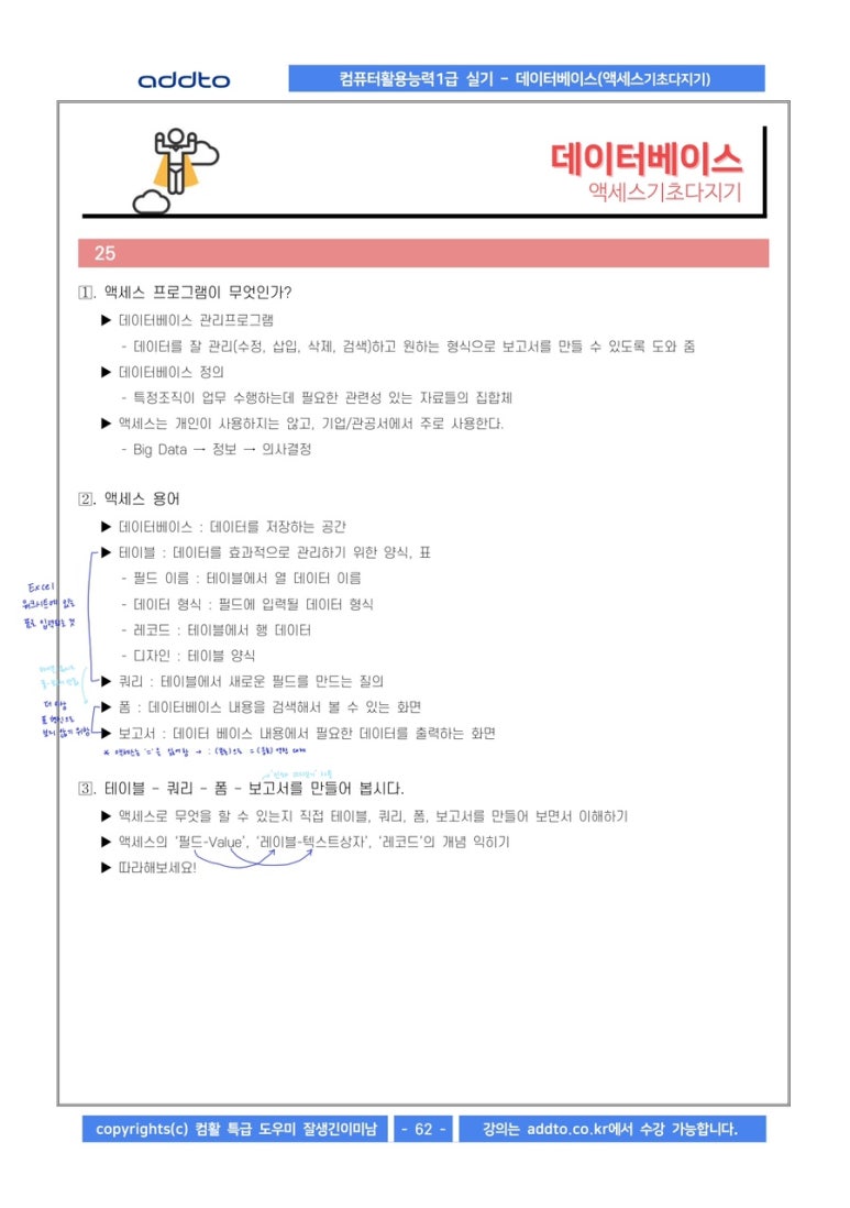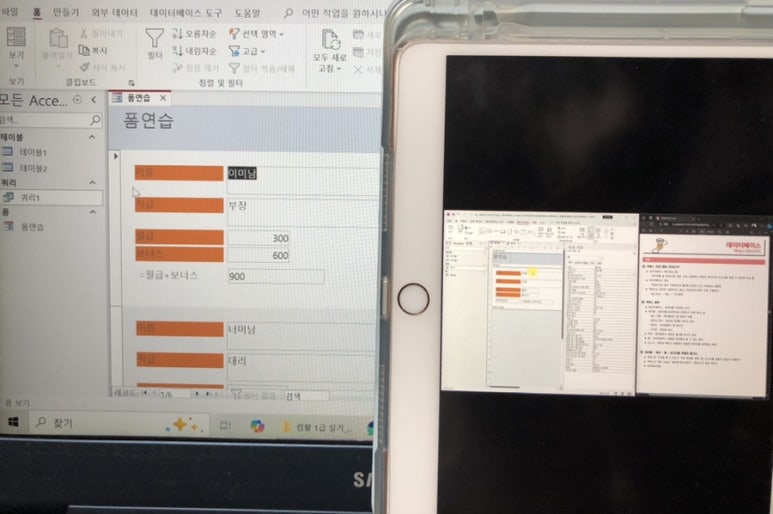 특히 액세스는 처음 들어서 처음에 따라가기 너무 힘든 거에요. 그래서 교재를 하나는 필기 있는 버전, 하나는 필기 없는 버전으로 해서 처음에 할 때는 필기 마구마구해서 밖에서도 쉽게 볼 수 있게 메모를 했구요. 하나는 필기 없는 버전으로 해서 실전처럼 연습할 때 패드 세로로 세운 후에 시험장처럼 연습했습니다!