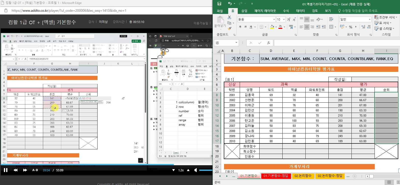 애드투 이미남 선생님 강의로 컴활 1급 실기 기본함수 영상을 보며 다시한번 주의할점을 확인했습니다.