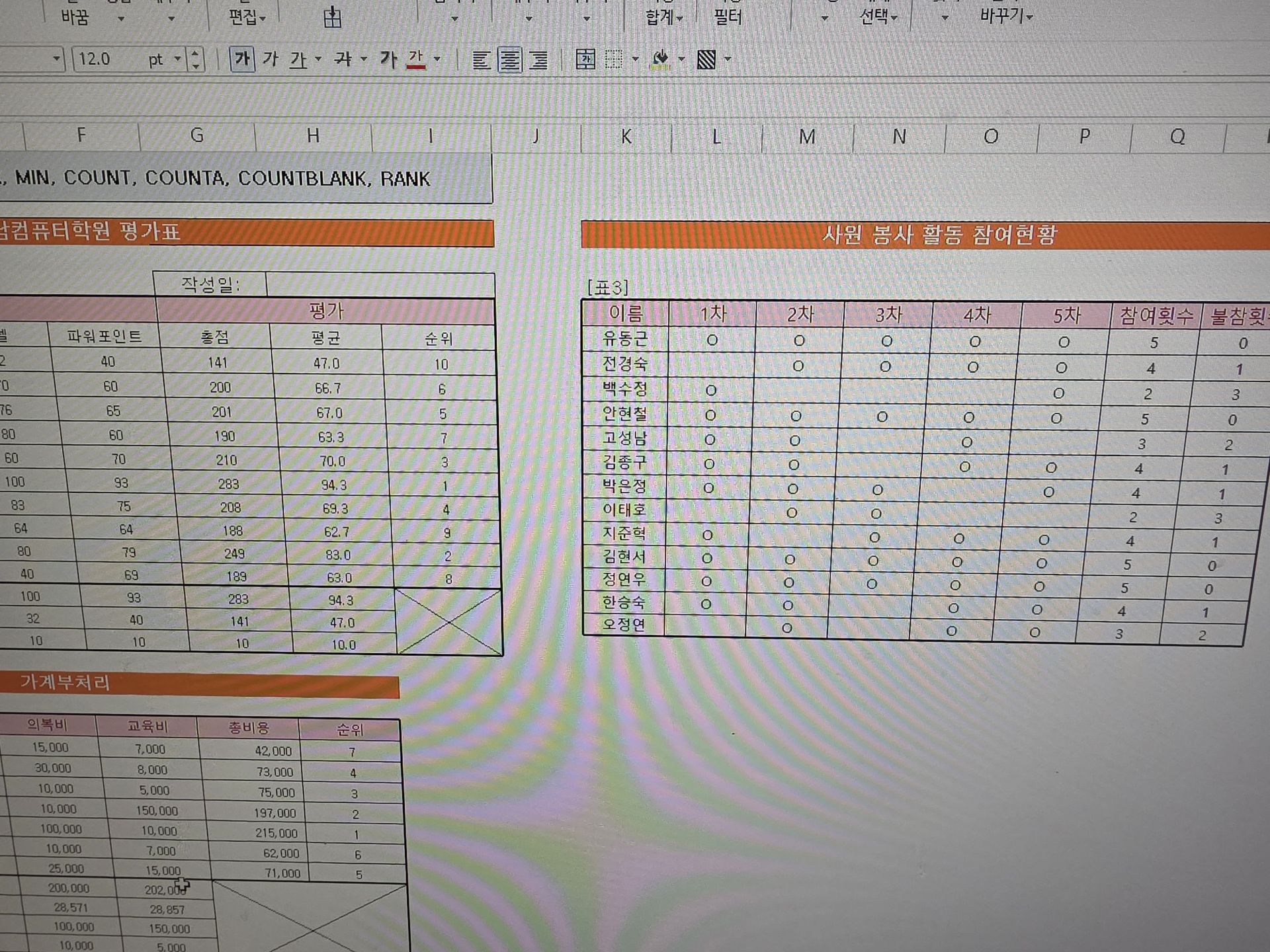 count, max, min, AVERAGE, SUM ,RANK.EQ 를 이용한 예제 문제 체크 등등! -