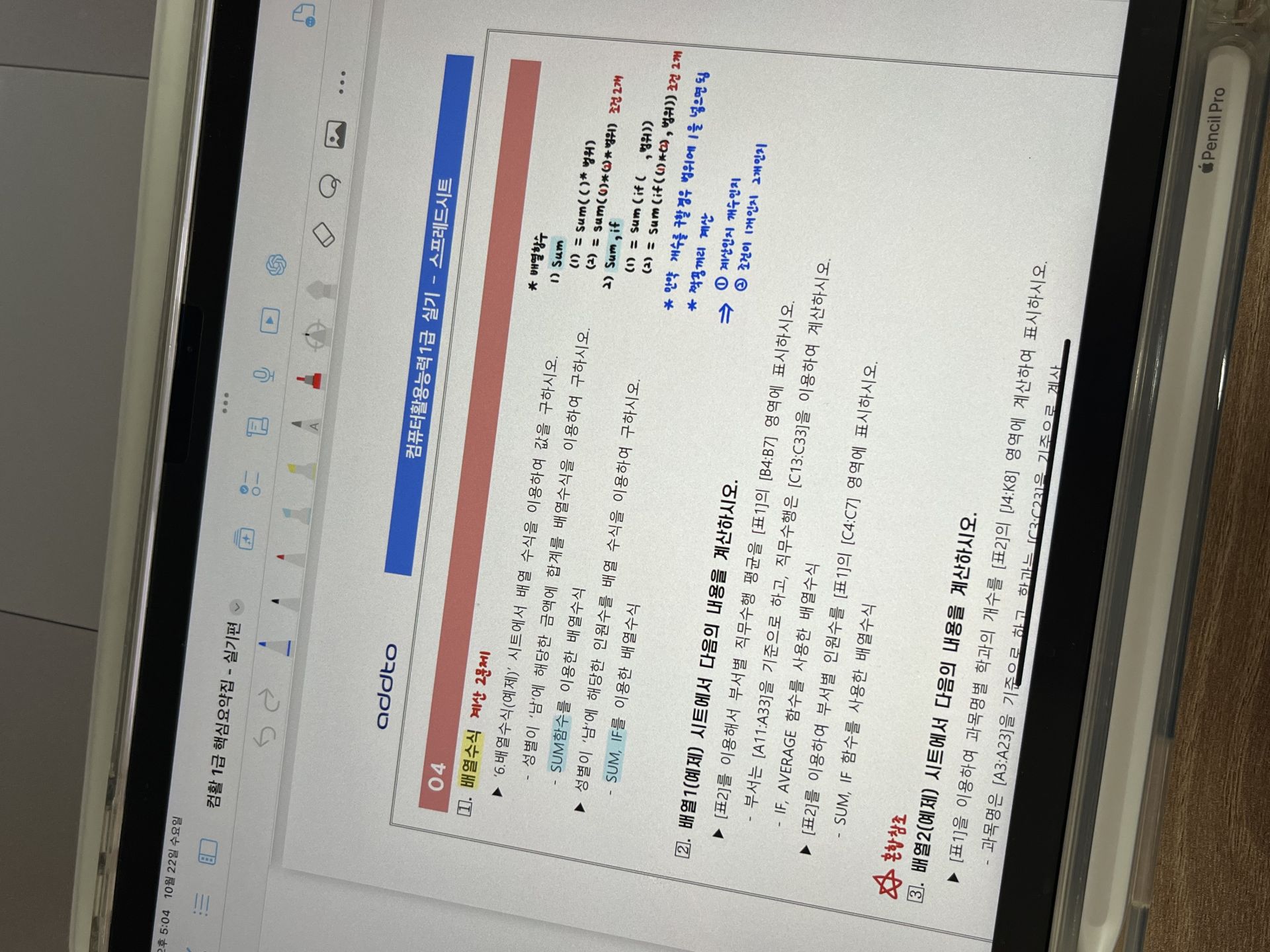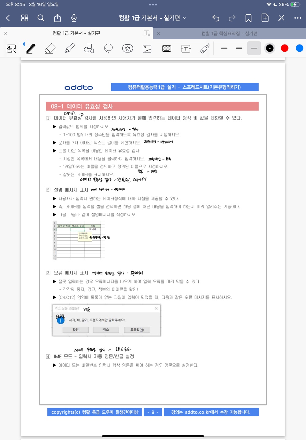 특히 액세스는 처음 들어서 처음에 따라가기 너무 힘든 거에요. 그래서 교재를 하나는 필기 있는 버전, 하나는 필기 없는 버전으로 해서 처음에 할 때는 필기 마구마구해서 밖에서도 쉽게 볼 수 있게 메모를 했구요. 하나는 필기 없는 버전으로 해서 실전처럼 연습할 때 패드 세로로 세운 후에 시험장처럼 연습했습니다!