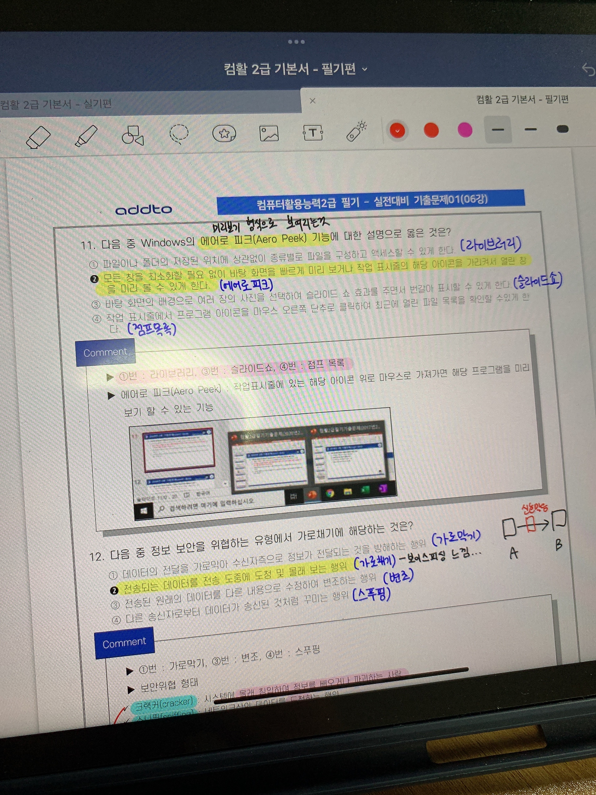 특히 액세스는 처음 들어서 처음에 따라가기 너무 힘든 거에요. 그래서 교재를 하나는 필기 있는 버전, 하나는 필기 없는 버전으로 해서 처음에 할 때는 필기 마구마구해서 밖에서도 쉽게 볼 수 있게 메모를 했구요. 하나는 필기 없는 버전으로 해서 실전처럼 연습할 때 패드 세로로 세운 후에 시험장처럼 연습했습니다!