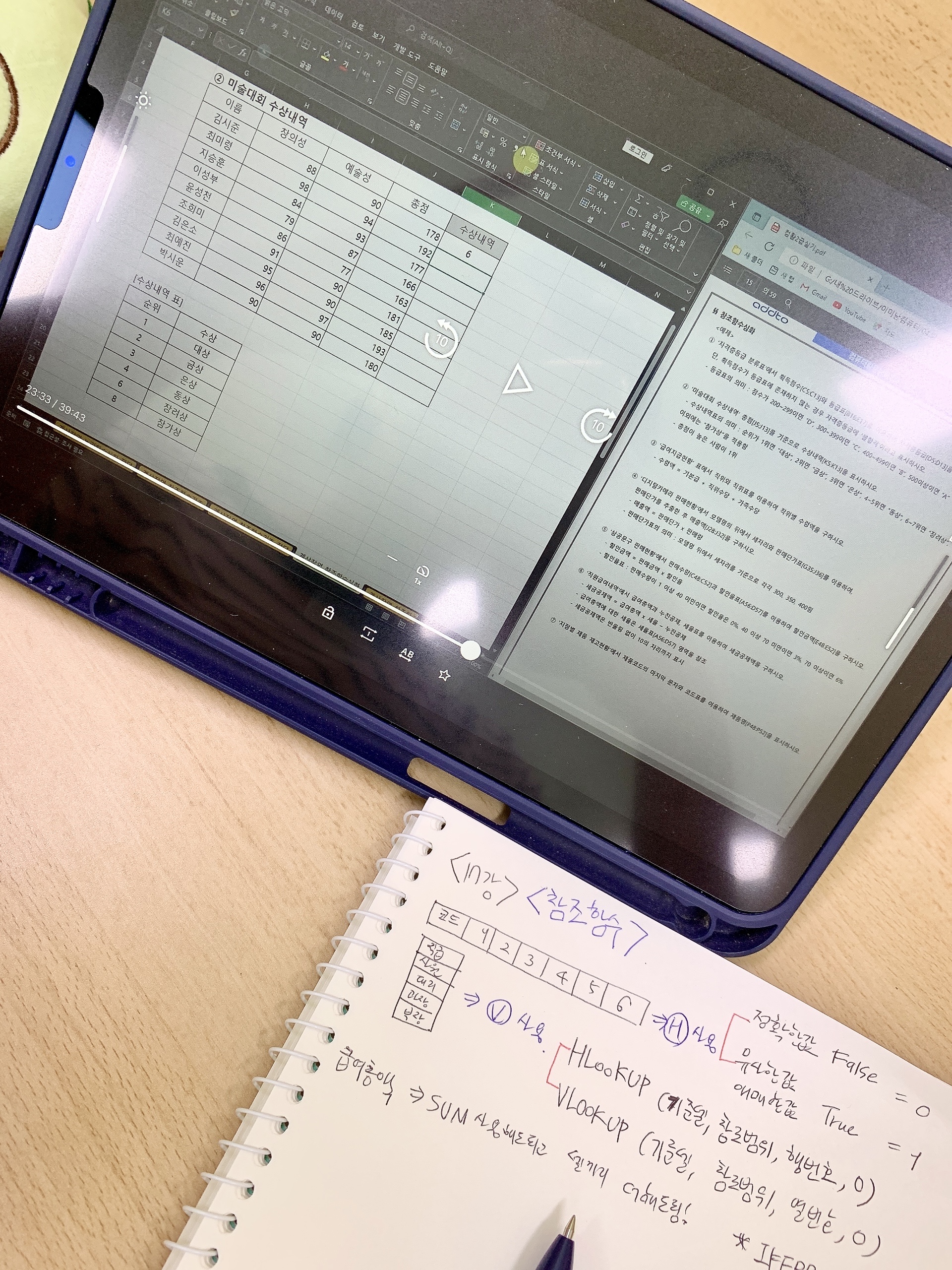 - BEST nave**** / 2025-04-01 #필기+실기 *이미남 컴활 1급 필기+실기 수강 후기* 컴활 1급 실기 엑셀 함수 열공 후기!!! 컴활 1급 실기 엑셀 함수 열공중, 오늘은 2일차라 학습 커리큘럼대로 3강-5강 듣기가 목표임. 1강을 통해 column, row, number, ref - rank.EQ 함수 , range - countif 함수, array 등 함수의 영어단어들 외우기를 마쳤다. 오늘은 참조함수, 날짜 시간함수, 문자열 함수로 시작한다. 필기 때부터 날 괴롭혔던 lookup함수... 참조함수란 표에서 내가 원하는 값을 구하지 못하지만 옆에 있는 표를 참조하면 결과를 가지고 올 수 있는 것이라 한다. ++ xlookup이 추가되었다고 한다. 표를 보고 행인지 열인지 어느 값을 쓸지를 보고 V를 쓸지 H를 쓸지 선택해서 사용하면 된다. 어디에서 절대참조가 필요한지도 연습하면서 F4키 눌러준다. True(1)/False(2) 정확한 값이 필요한지 유사값이 필요한지도 구분하여야한다. VLOOKUP(lookup_value, table_array, col_index_num, [range_lookup]) 샘 강의 듣고 오늘자로 뽀갠다!!!! 필기는 2트로 냅다 따버렸지만 독학 실기의 벽에 가로막힌 나에게 단비같은 애드투 강의가 내려왔다... 아예 컴활 다시 공부할 생각도 안하고 있어 외웠던 함수들도 까먹고 있었는데.. 차근차근 짚어주시는 애드투 이미남 선생님... 감사합니다 흑흑