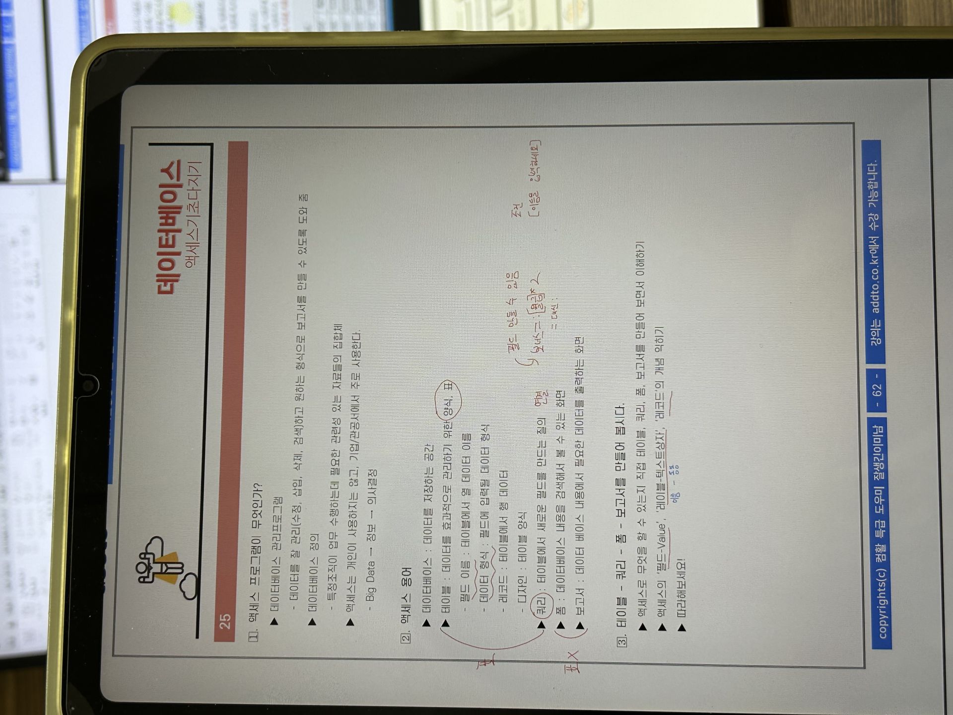 특히 액세스는 처음 들어서 처음에 따라가기 너무 힘든 거에요. 그래서 교재를 하나는 필기 있는 버전, 하나는 필기 없는 버전으로 해서 처음에 할 때는 필기 마구마구해서 밖에서도 쉽게 볼 수 있게 메모를 했구요. 하나는 필기 없는 버전으로 해서 실전처럼 연습할 때 패드 세로로 세운 후에 시험장처럼 연습했습니다!