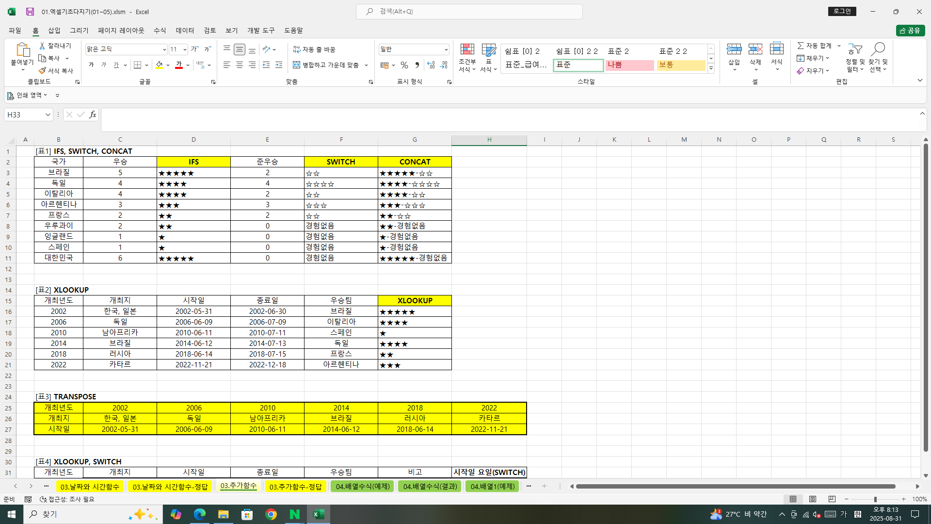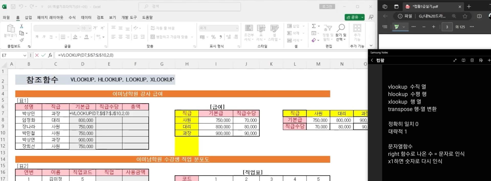 - BEST nave**** / 2025-04-01 #필기+실기 *이미남 컴활 1급 필기+실기 수강 후기* 컴활 1급 실기 엑셀 함수 열공 후기!!! 컴활 1급 실기 엑셀 함수 열공중, 오늘은 2일차라 학습 커리큘럼대로 3강-5강 듣기가 목표임. 1강을 통해 column, row, number, ref - rank.EQ 함수 , range - countif 함수, array 등 함수의 영어단어들 외우기를 마쳤다. 오늘은 참조함수, 날짜 시간함수, 문자열 함수로 시작한다. 필기 때부터 날 괴롭혔던 lookup함수... 참조함수란 표에서 내가 원하는 값을 구하지 못하지만 옆에 있는 표를 참조하면 결과를 가지고 올 수 있는 것이라 한다. ++ xlookup이 추가되었다고 한다. 표를 보고 행인지 열인지 어느 값을 쓸지를 보고 V를 쓸지 H를 쓸지 선택해서 사용하면 된다. 어디에서 절대참조가 필요한지도 연습하면서 F4키 눌러준다. True(1)/False(2) 정확한 값이 필요한지 유사값이 필요한지도 구분하여야한다. VLOOKUP(lookup_value, table_array, col_index_num, [range_lookup]) 샘 강의 듣고 오늘자로 뽀갠다!!!! 필기는 2트로 냅다 따버렸지만 독학 실기의 벽에 가로막힌 나에게 단비같은 애드투 강의가 내려왔다... 아예 컴활 다시 공부할 생각도 안하고 있어 외웠던 함수들도 까먹고 있었는데.. 차근차근 짚어주시는 애드투 이미남 선생님... 감사합니다 흑흑