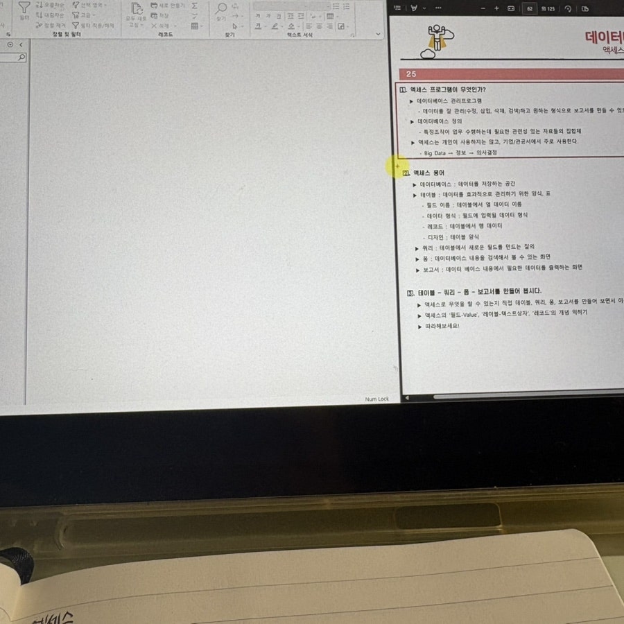 특히 액세스는 처음 들어서 처음에 따라가기 너무 힘든 거에요. 그래서 교재를 하나는 필기 있는 버전, 하나는 필기 없는 버전으로 해서 처음에 할 때는 필기 마구마구해서 밖에서도 쉽게 볼 수 있게 메모를 했구요. 하나는 필기 없는 버전으로 해서 실전처럼 연습할 때 패드 세로로 세운 후에 시험장처럼 연습했습니다!