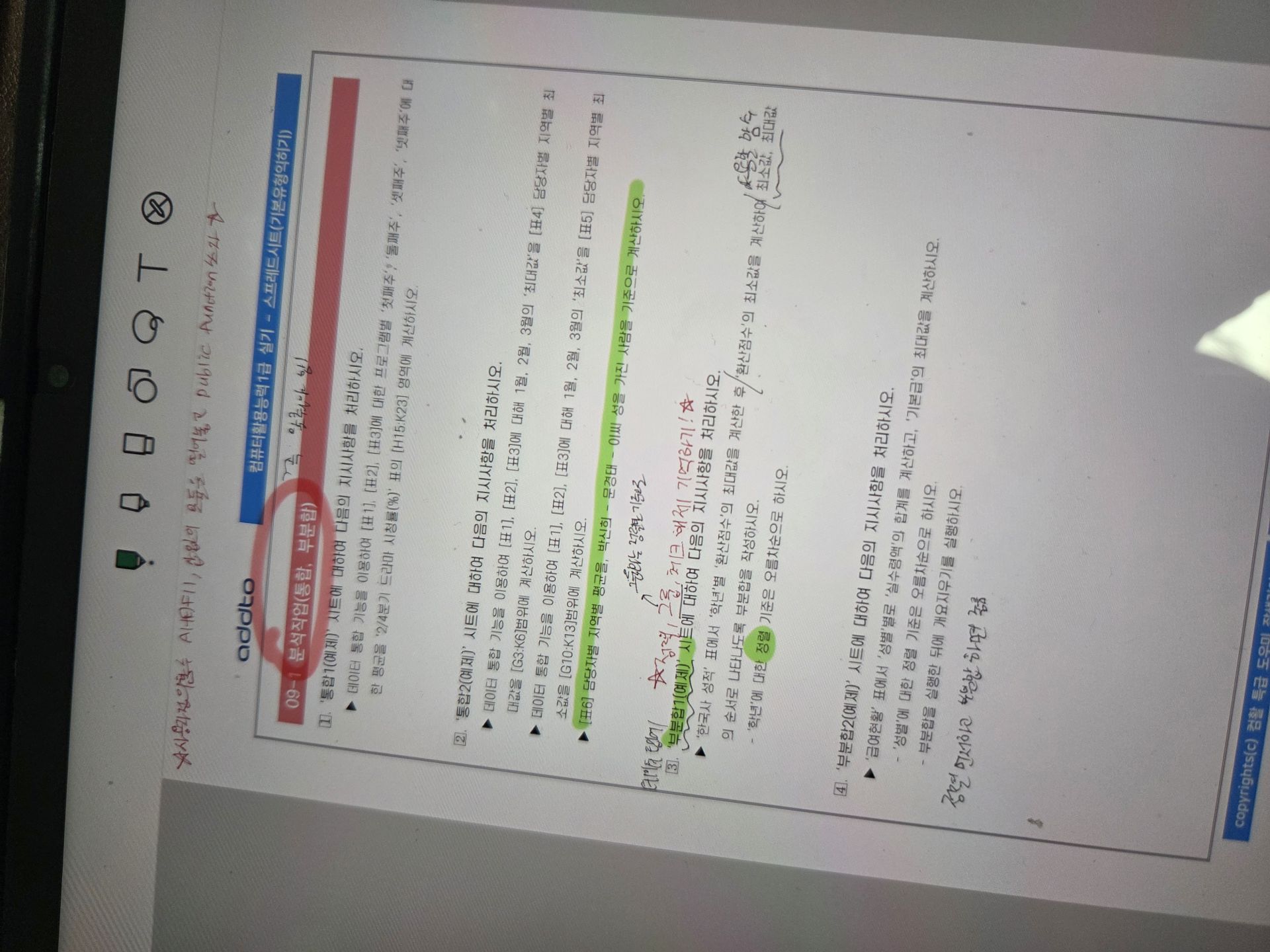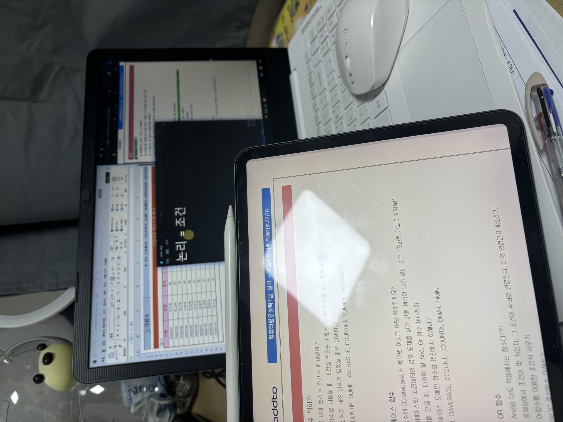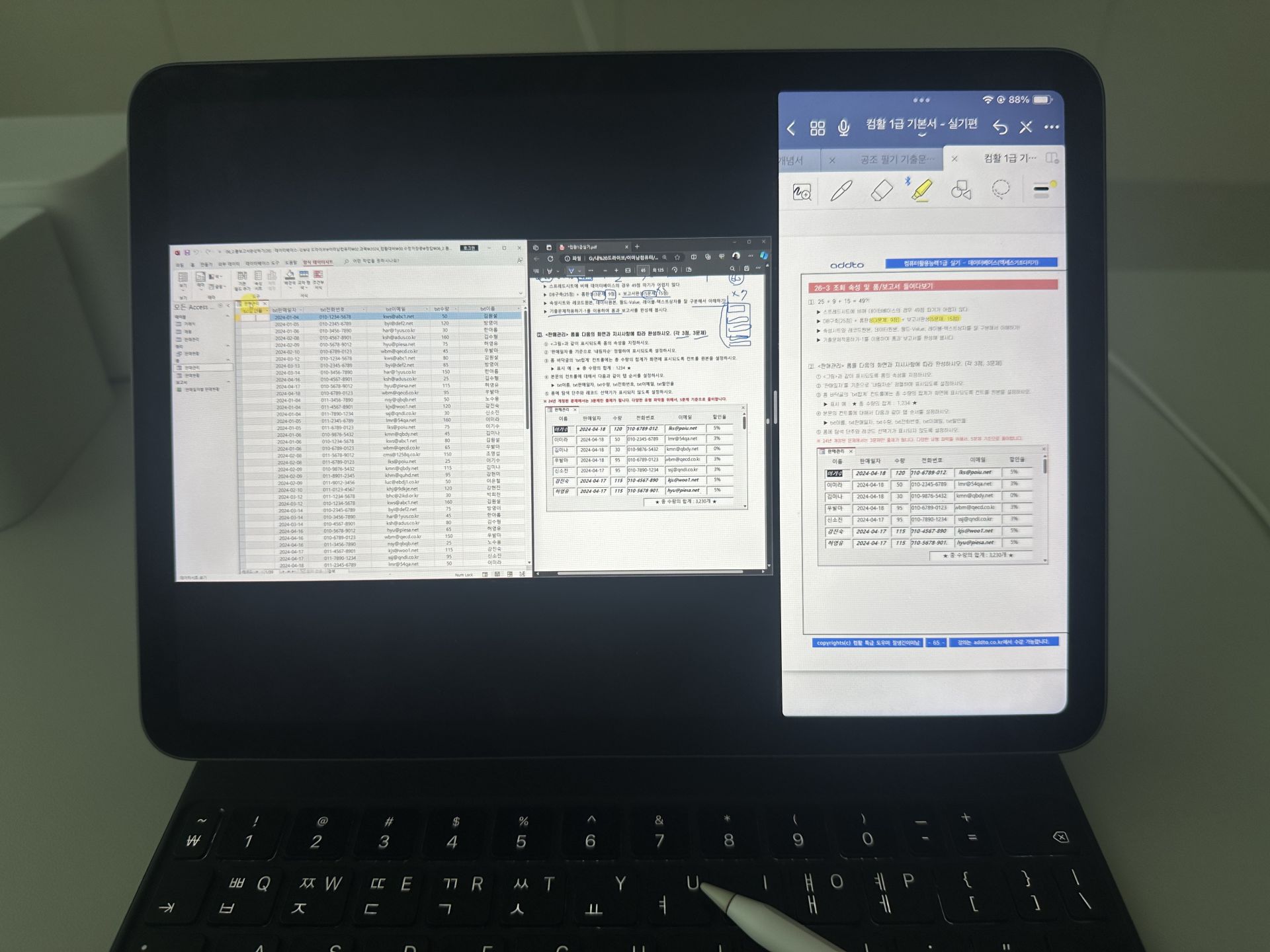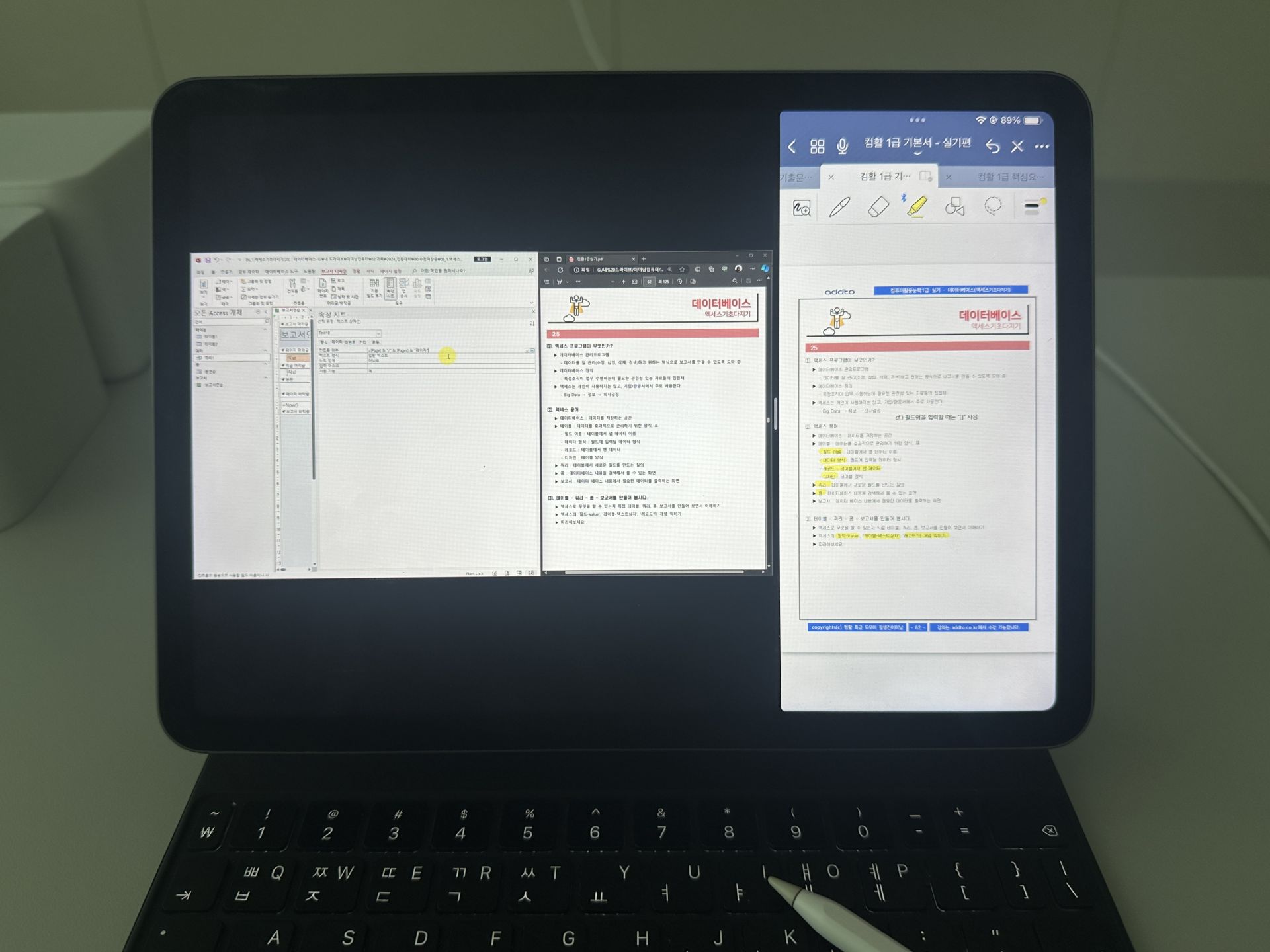 특히 액세스는 처음 들어서 처음에 따라가기 너무 힘든 거에요. 그래서 교재를 하나는 필기 있는 버전, 하나는 필기 없는 버전으로 해서 처음에 할 때는 필기 마구마구해서 밖에서도 쉽게 볼 수 있게 메모를 했구요. 하나는 필기 없는 버전으로 해서 실전처럼 연습할 때 패드 세로로 세운 후에 시험장처럼 연습했습니다!