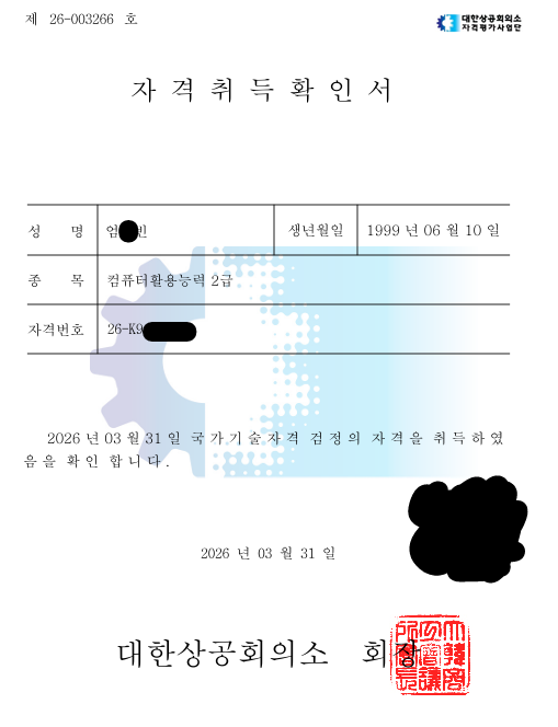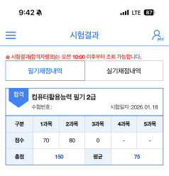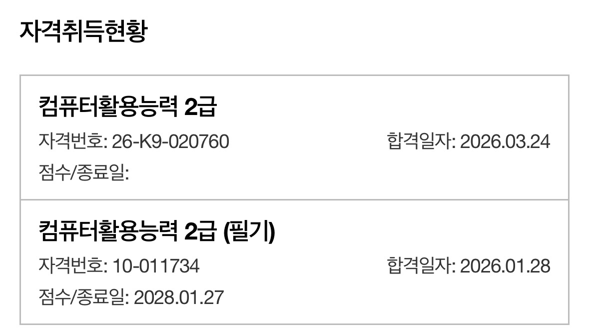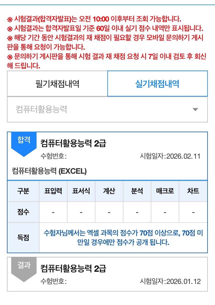 kaka**** / 2026-03-18 내돈내산! 컴활 1급 필기 실기 합격 후기 애드투 이미남 선생님의 컴퓨터활용능력 2급 필기, 실기에 합격했습니다. 1급을 준비하다가 준비기간이 너무 길어질 것 같아서 2급으로 바꿨고, 지금 생각해보면 잘한 선택인것 같아요. 인강이랑 제공된 자료들을 보고 잘 공부해서 필기, 실기 각각 1트만에 합격했어요! 준비된 커리큘럼대로 따라가면 돼고 저는 기간을 넉넉하게 잡아서 2달 정도 공부했습니다. 하루에 1시간정도로 많은 시간을 투자하지는 않았어요. 필기는 개념내용을 정확하게 아는 것이 중요하고 실기는 강의 보면서 여러번 따라해보면 어렵지 않게 취득하실 수 있습니다!!