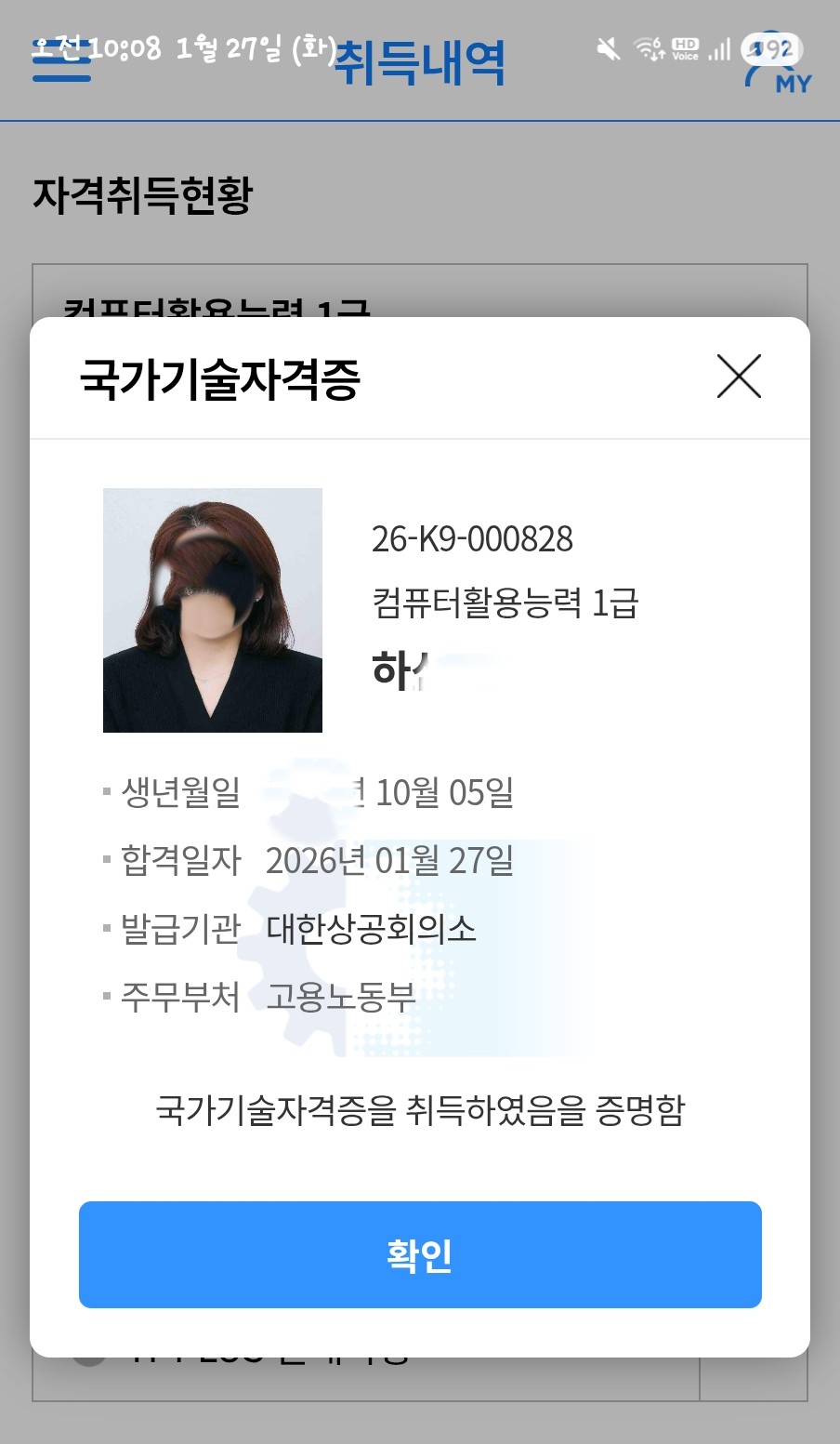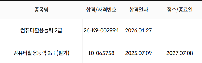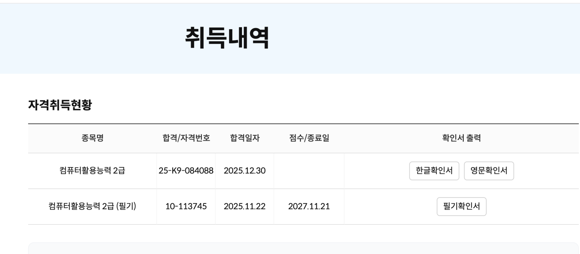 저는 컴퓨터활용능력 2급에 응시하였고, 필기와 실기 모두 1회 응시로 합격하였으며 전체 준비 기간은 약 3주 정도였습니다.