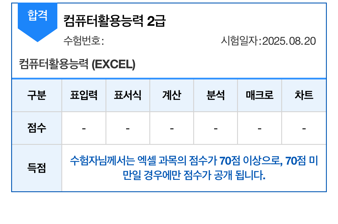 본 시험에서 함수 계산 문제, 조건부 서식 문제 총 두문제를 아예 못 풀었지만 나머지는 열심히 풀어서 합격할 수 있었어요.